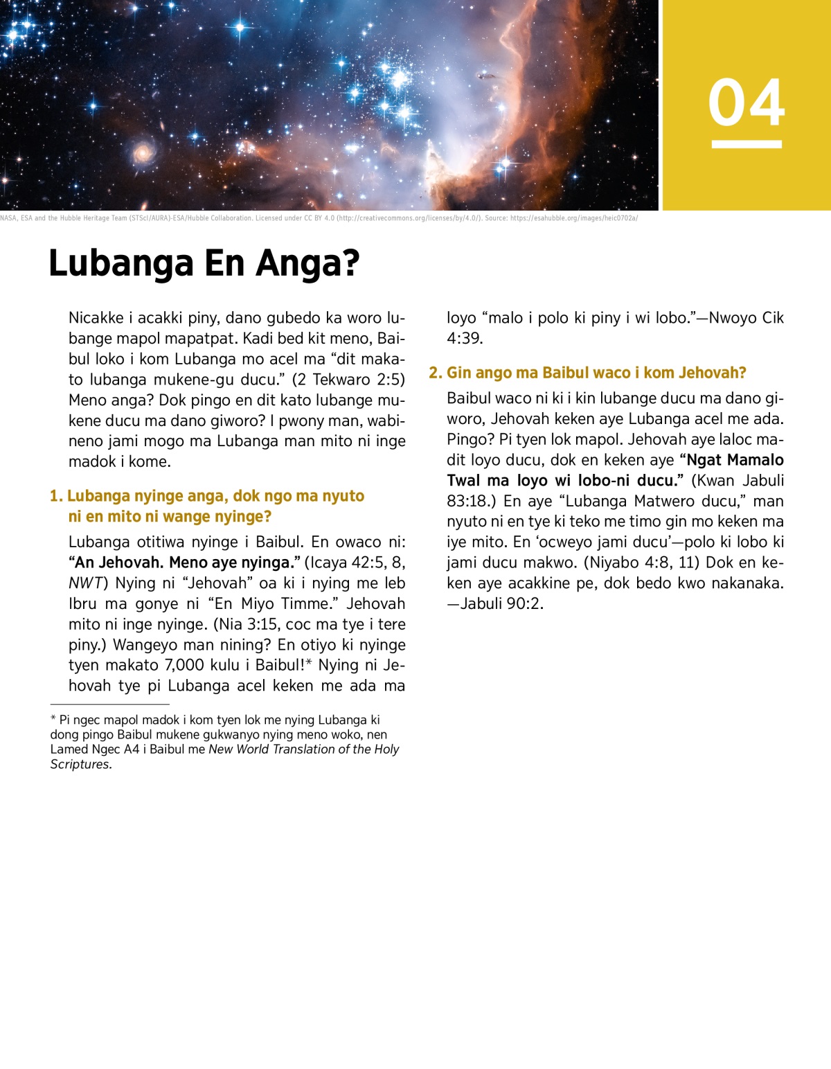 Lubanga otitiwa nyinge i Baibul. En owaco ni: “An Jehovah. Meno aye nyinga.” (Icaya 42:5, 8, NWT) Nying ni “Jehovah” oa ki i nying me leb Ibru ma gonye ni “En Miyo Timme.” Jehovah mito ni inge nyinge. (Nia 3:15, coc ma tye i tere piny.) Wangeyo man nining? En otiyo ki nyinge tyen makato 7,000 kulu i Baibul!a Nying ni Jehovah tye pi Lubanga acel keken me ada ma loyo “malo i polo ki piny i wi lobo.”—Nwoyo Cik 4:39.