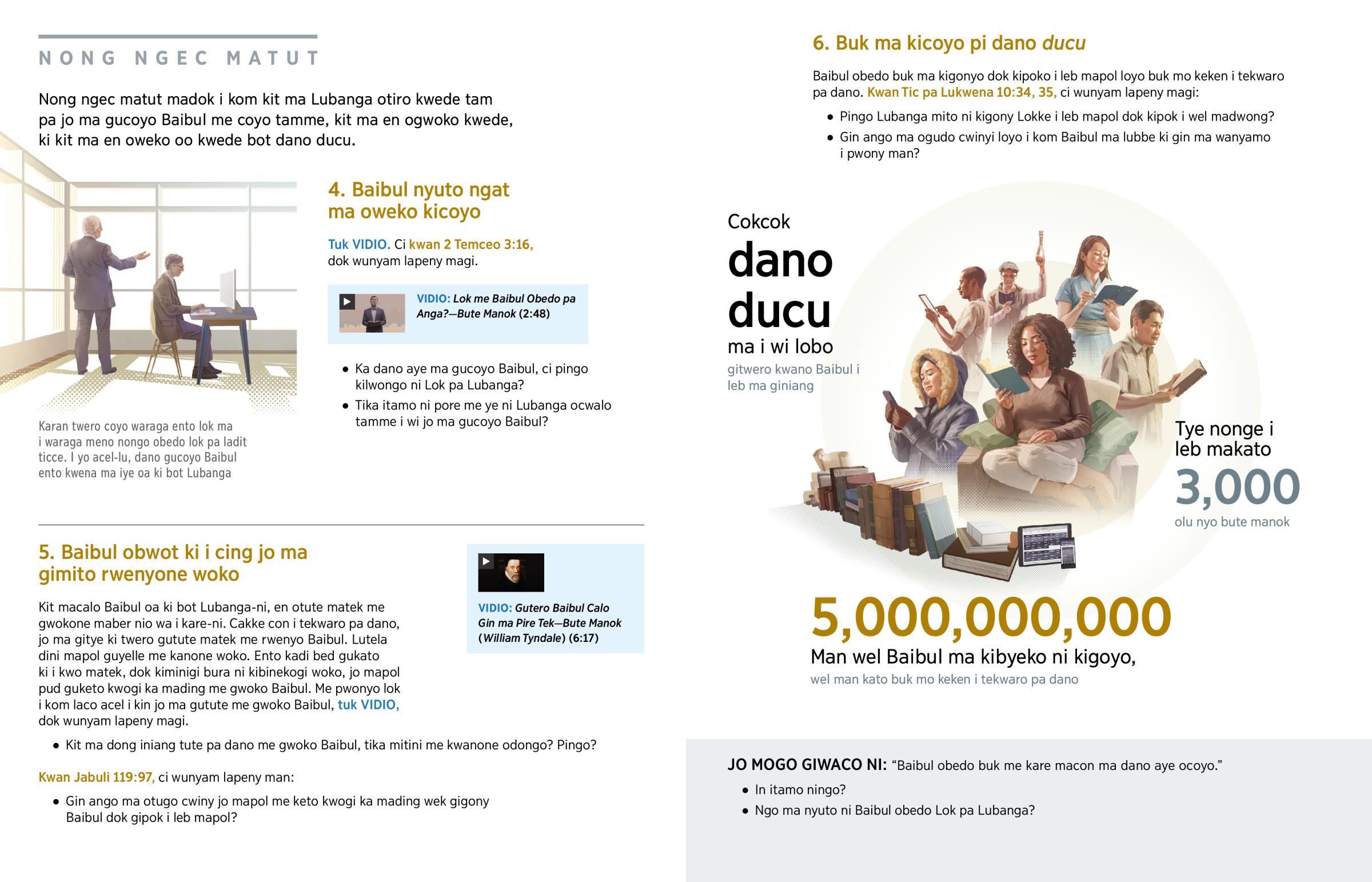 JO MOGO GIWACO NI: “Baibul obedo buk me kare macon ma dano aye ocoyo.”