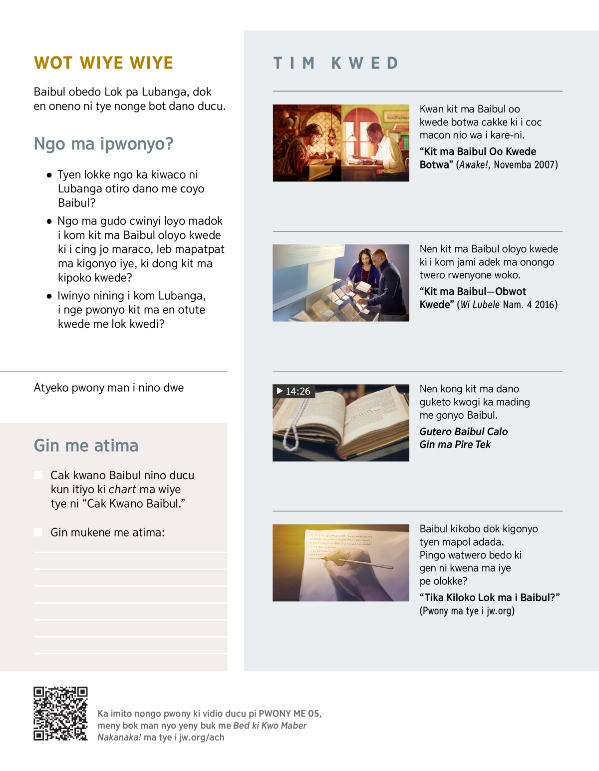 Kit ma dong iniang tute pa dano me gwoko Baibul, tika mitini me kwanone odongo? Pingo?