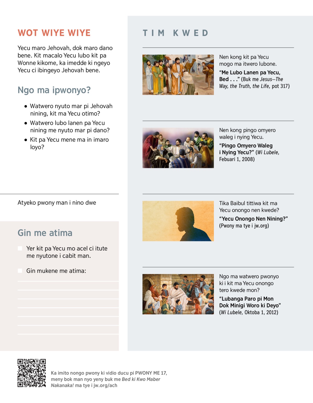 Pwony lok mapol madok i kom kit pa Yecu. Dok inen kit me nyuto mar kacel ki yot cing kit ma en otimo kwede.