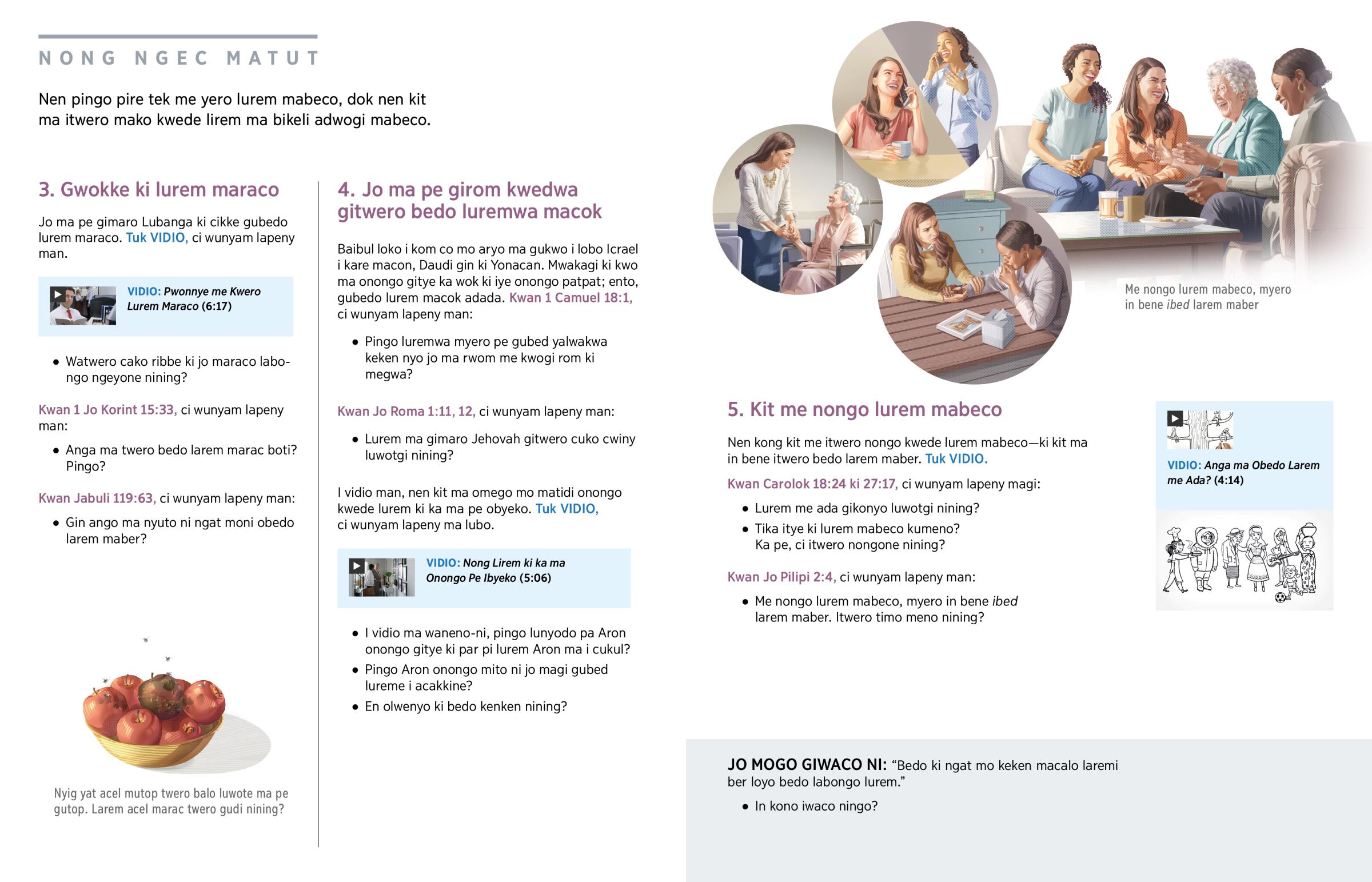 Walubo kit pa jo ma wacwalo cawa malac kwedgi. Man twero bedo kit mabeco nyo kit maraco—dok timme ka wamaro bedo kacel kwedgi nyo wakubbe kwedgi kun watiyo ki kabedo me nywako lok i intanet. Kit ma Baibul owaco kwede, “ngat ma bedo kacel ki jo maryek pwonnye doko ryek bene, ento ngat ma mako lurem ki luming [jo ma pe maro Jehovah] kite biballe woko.” (Carolok 13:20) Lurem ma gimaro dok giworo Jehovah twero konyi me bedo cok kwede ki dok me moko tam mabeco. Ento mako lirem ki jo ma pe maro Jehovah twero balo watti ki Jehovah. Meno aye tyen lok mumiyo Baibul cuko cwinywa me yero luremwa ki ryeko! Ka luremwa obedo jo ma gimaro Lubanga, ci wan ducu wanongo adwogi maber. Wabibedo ki kare me ‘cuko cwinywa kekenwa, ki dok me konye kekenwa wek wadong i yo me cwiny.’—1 Jo Tecalonika 5:11.