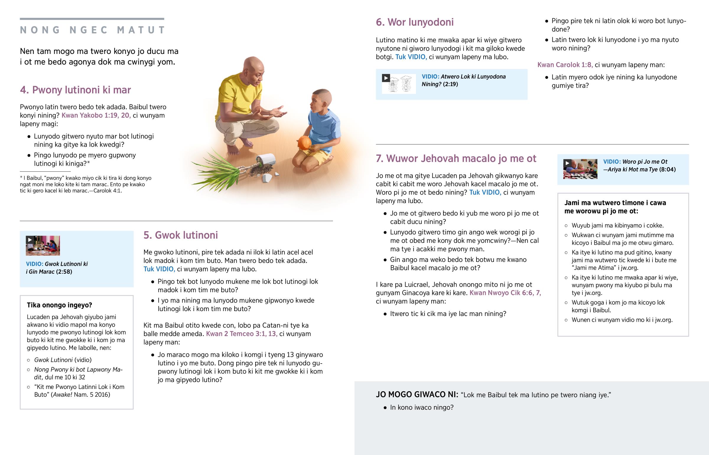 Jehovah mito ni lunyodo gumar lutinogi dok gutute matek me cwalo cawa malac kwedgi. En bene mito ni lunyodo gugwok lutinogi ki i jami ma twero wanogi dok guti ki cik ma igi lac me Baibul me pwonyo lutino. (Carolok 1:8) En owaco bot wegi lutino ni: ‘Wupwony lutinowu ki kit mabeco ma Jehovah pwoyo.’ (Kwan Jo Epeco 6:4.) Jehovah bedo ki yomcwiny ka lunyodo gilubo tirane ka gitye ka pwonyo lutinogi ki dok ka pe gimiyo tic meno bot ngat mukene.