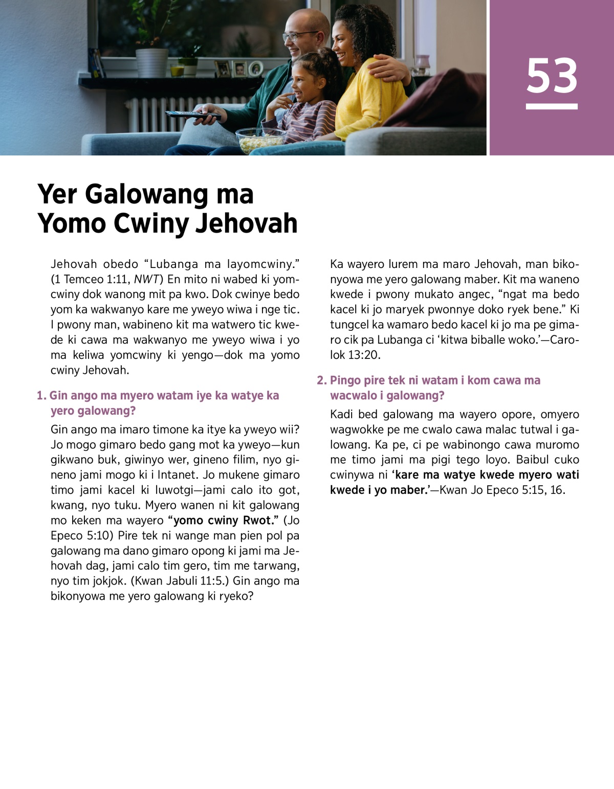 Jehovah obedo “Lubanga ma layomcwiny.” (1 Temceo 1:11, NWT) En mito ni wabed ki yomcwiny dok wanong mit pa kwo. Dok cwinye bedo yom ka wakwanyo kare me yweyo wiwa i nge tic. I pwony man, wabineno kit ma watwero tic kwede ki cawa ma wakwanyo me yweyo wiwa i yo ma keliwa yomcwiny ki yengo—dok ma yomo cwiny Jehovah.