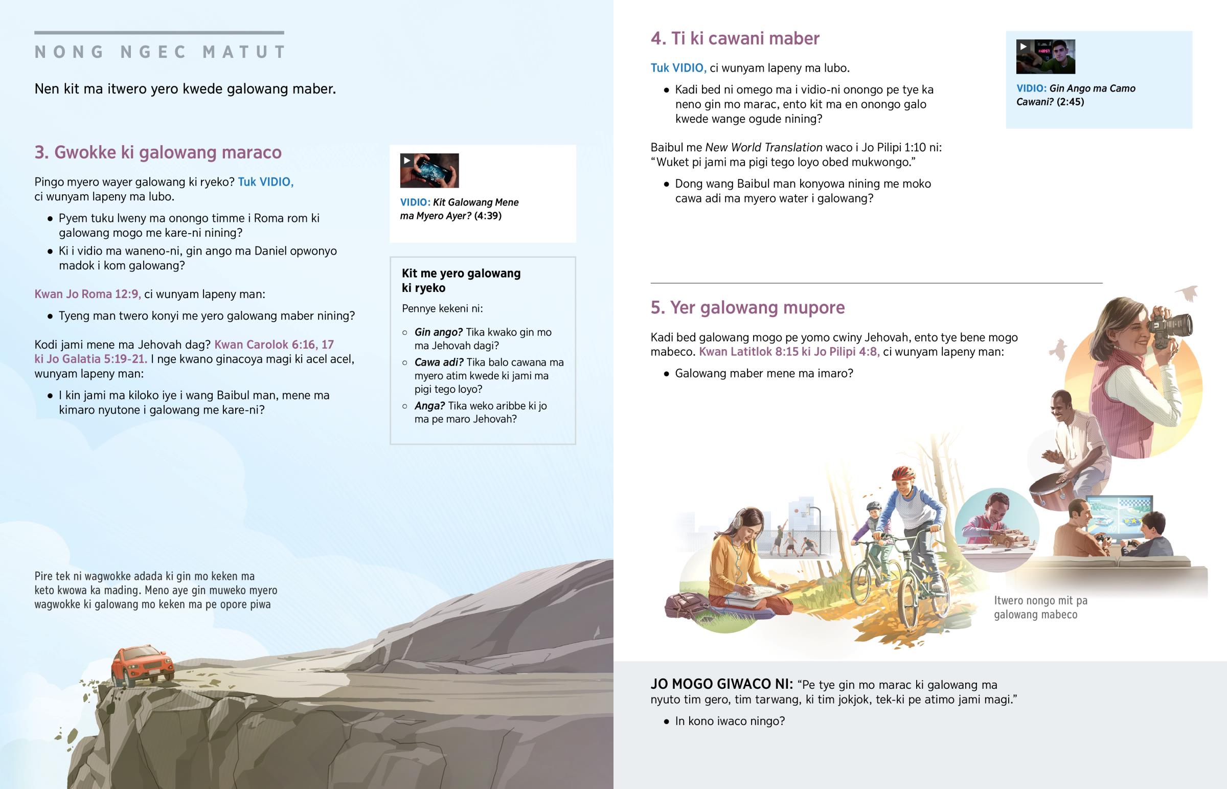 Gin ango ma imaro timone ka itye ka yweyo wii? Jo mogo gimaro bedo gang mot ka yweyo—kun gikwano buk, giwinyo wer, gineno filim, nyo gineno jami mogo ki i Intanet. Jo mukene gimaro timo jami kacel ki luwotgi—jami calo ito got, kwang, nyo tuku. Myero wanen ni kit galowang mo keken ma wayero “yomo cwiny Rwot.” (Jo Epeco 5:10) Pire tek ni wange man pien pol pa galowang ma dano gimaro opong ki jami ma Jehovah dag, jami calo tim gero, tim me tarwang, nyo tim jokjok. (Kwan Jabuli 11:5.) Gin ango ma bikonyowa me yero galowang ki ryeko?