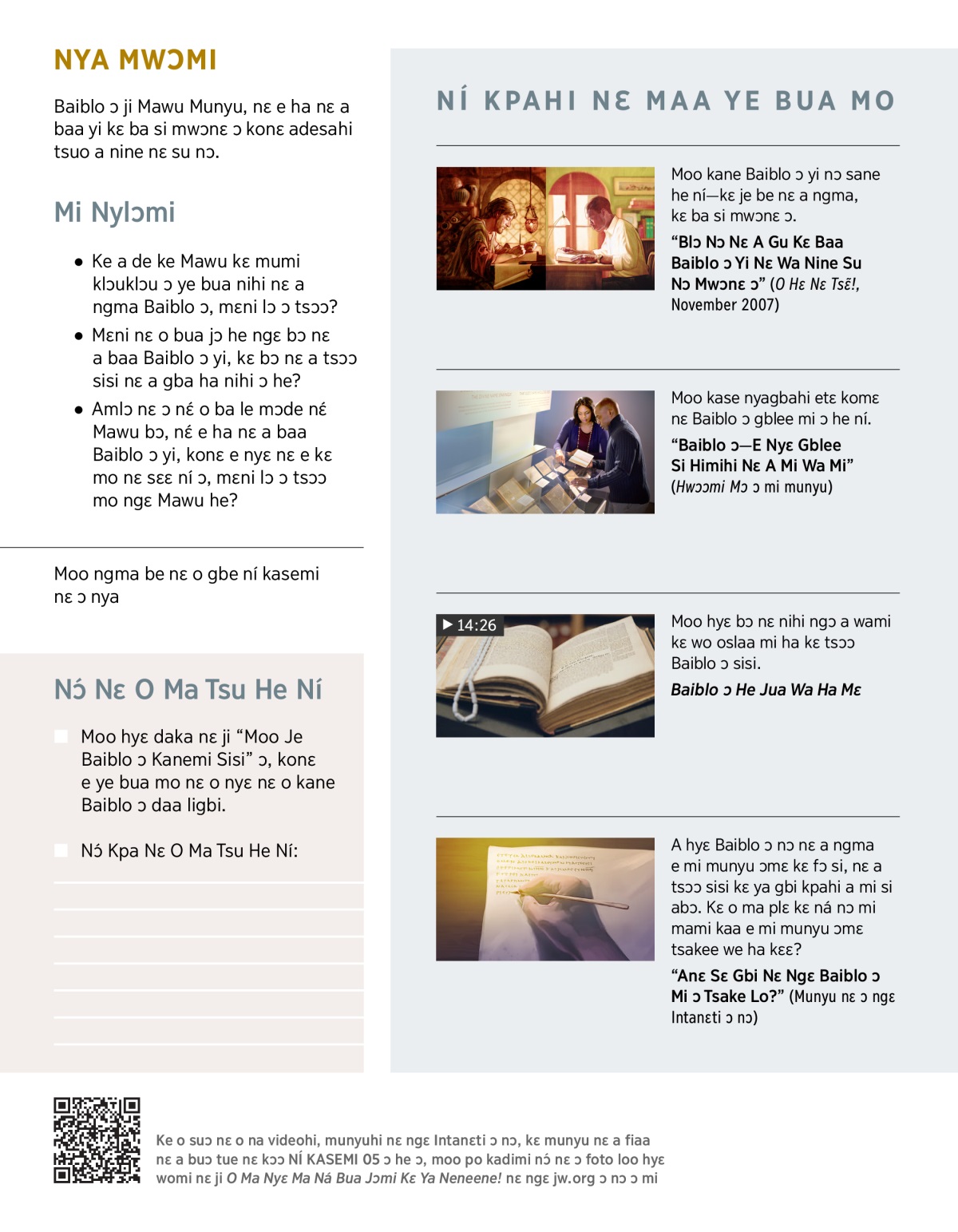 “Blɔ Nɔ Nɛ A Gu Kɛ Baa Baiblo ɔ Yi Nɛ Wa Nine Su Nɔ Mwɔnɛ ɔ” (O Hɛ Nɛ Tsɛ̃!, November 2007)