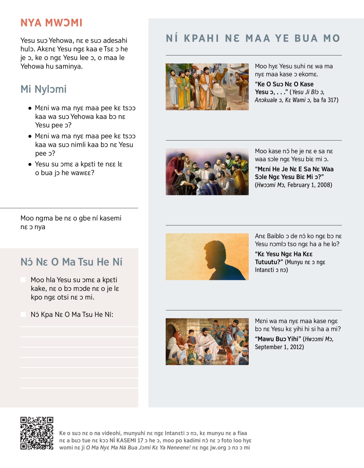 Ke wa kase níhi nɛ Yesu de, kɛ níhi nɛ e pee benɛ e ngɛ zugba a nɔ ɔ he ní ɔ, wa maa le su kpakpahi nɛ e ngɛ ɔ, nɛ lɔ ɔ ma ha nɛ waa hɛ wɔ kɛ su e kɛ e Tsɛ Yehowa a he. Mɛni ji su kpakpahi nɛ Yesu ngɛ ɔ ekomɛ? Nɛ mɛni blɔ nɔ wa maa gu kɛ kase lɛ?