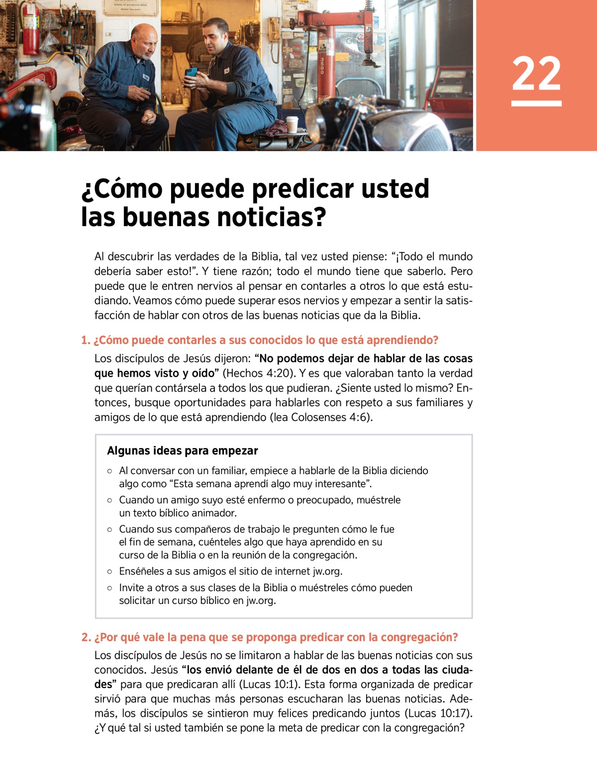 Los discípulos de Jesús no se limitaron a hablar de las buenas noticias con sus conocidos. Jesús “los envió delante de él de dos en dos a todas las ciudades” para que predicaran allí (Lucas 10:1). Esta forma organizada de predicar sirvió para que muchas más personas escucharan las buenas noticias. Además, los discípulos se sintieron muy felices predicando juntos (Lucas 10:17). ¿Y qué tal si usted también se pone la meta de predicar con la congregación?