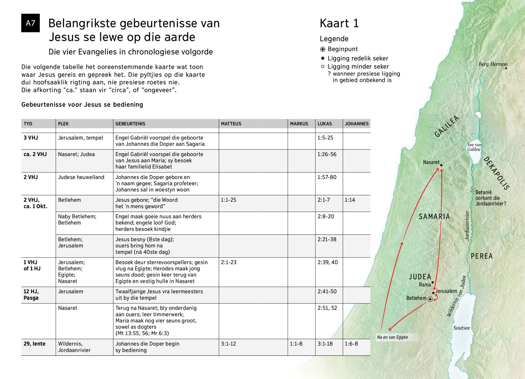 waar Jesus gereis en gepreek het. Die pyltjies op die kaarte dui hoofsaaklik rigting aan, nie presiese roetes nie. Die afkorting “ca.” staan vir “circa”, of “ongeveer”.