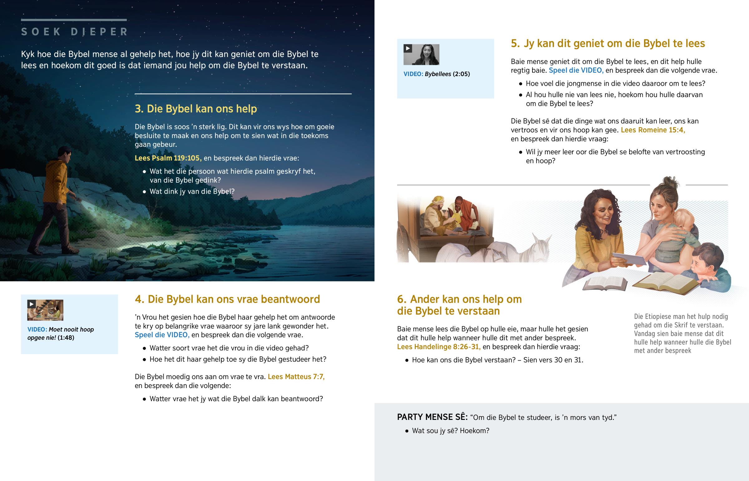 Kyk hoe die Bybel mense al gehelp het, hoe jy dit kan geniet om die Bybel te lees en hoekom dit goed is dat iemand jou help om die Bybel te verstaan.