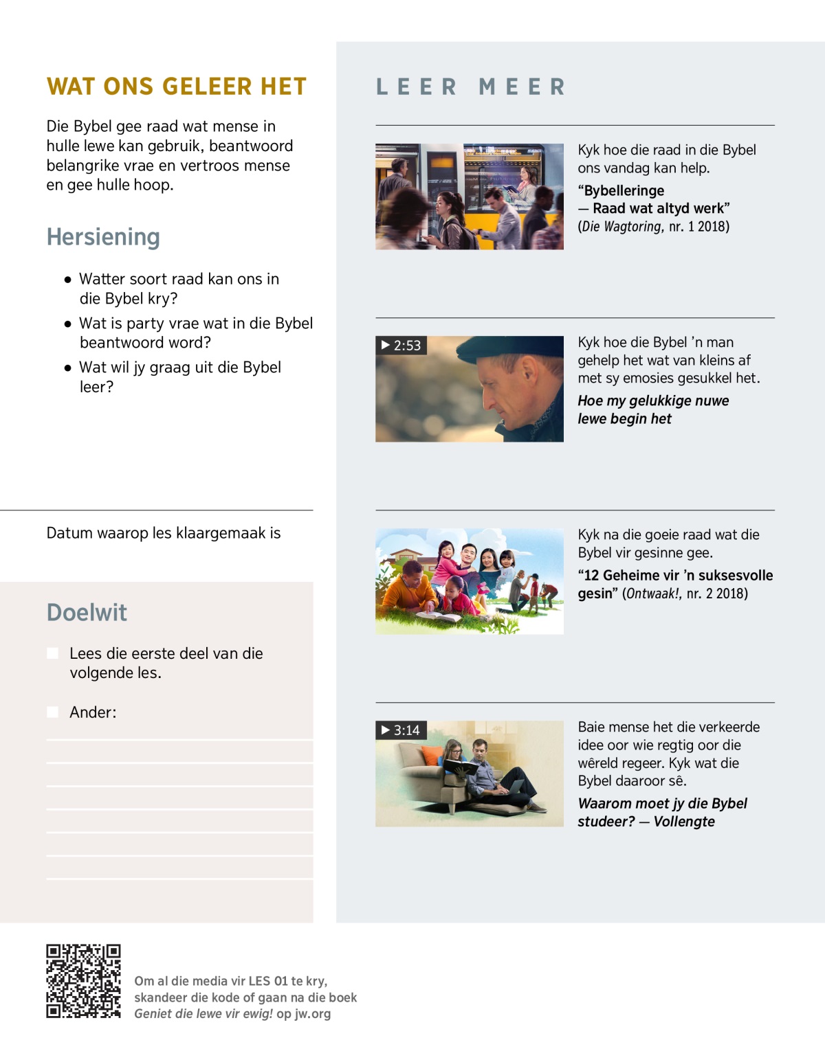 Hierdie boek vervang nie die Bybel nie. Dit moedig jou eerder aan om self te kyk wat die Bybel sê. Daarom wil ons graag hê dat jy die tekste in hierdie lesse moet lees en dit moet vergelyk met wat jy leer.