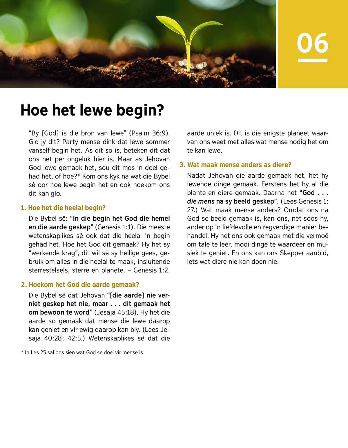 “By [God] is die bron van lewe” (Psalm 36:9). Glo jy dit? Party mense dink dat lewe sommer vanself begin het. As dit so is, beteken dit dat ons net per ongeluk hier is. Maar as Jehovah God lewe gemaak het, sou dit mos ’n doel gehad het, of hoe?a Kom ons kyk na wat die Bybel sê oor hoe lewe begin het en ook hoekom ons dit kan glo.