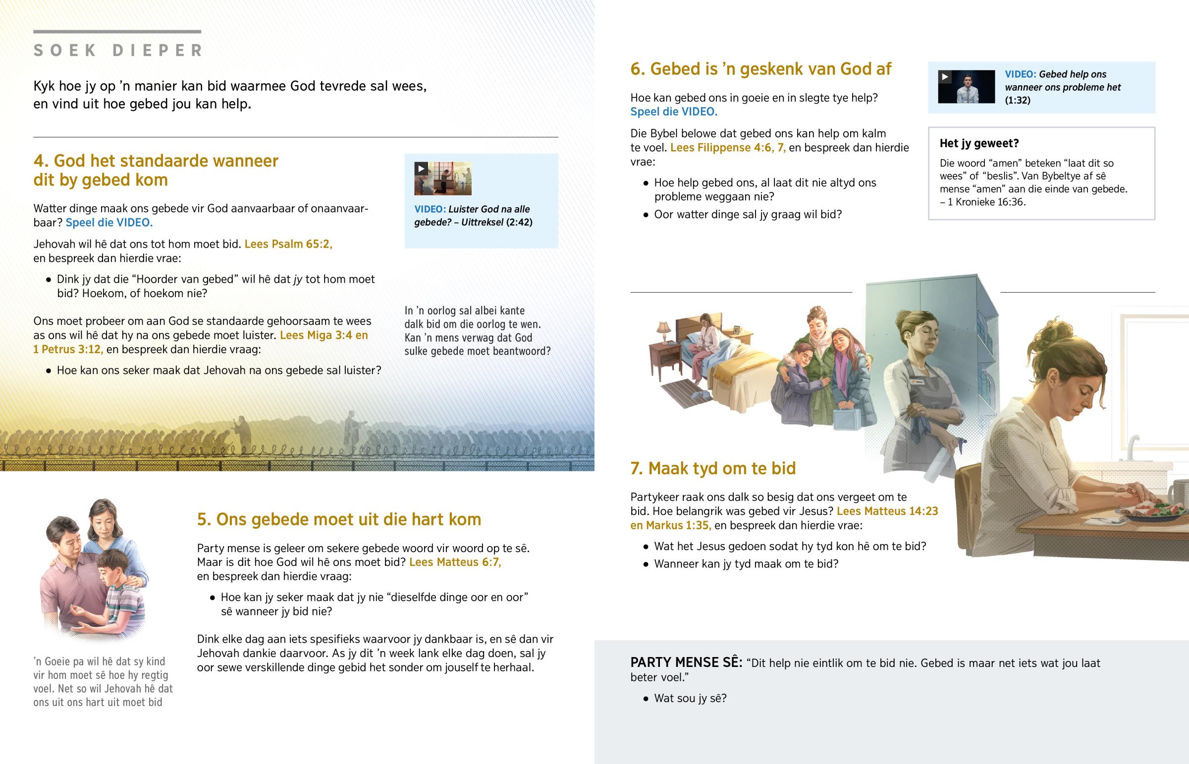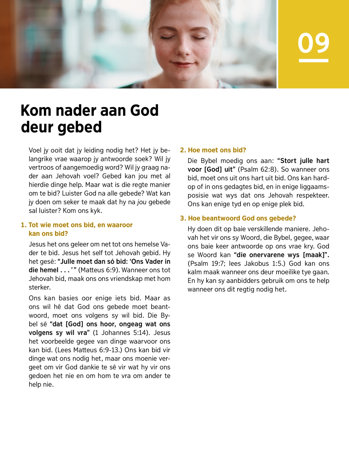 Voel jy ooit dat jy leiding nodig het? Het jy belangrike vrae waarop jy antwoorde soek? Wil jy vertroos of aangemoedig word? Wil jy graag nader aan Jehovah voel? Gebed kan jou met al hierdie dinge help. Maar wat is die regte manier om te bid? Luister God na alle gebede? Wat kan jy doen om seker te maak dat hy na jou gebede sal luister? Kom ons kyk.