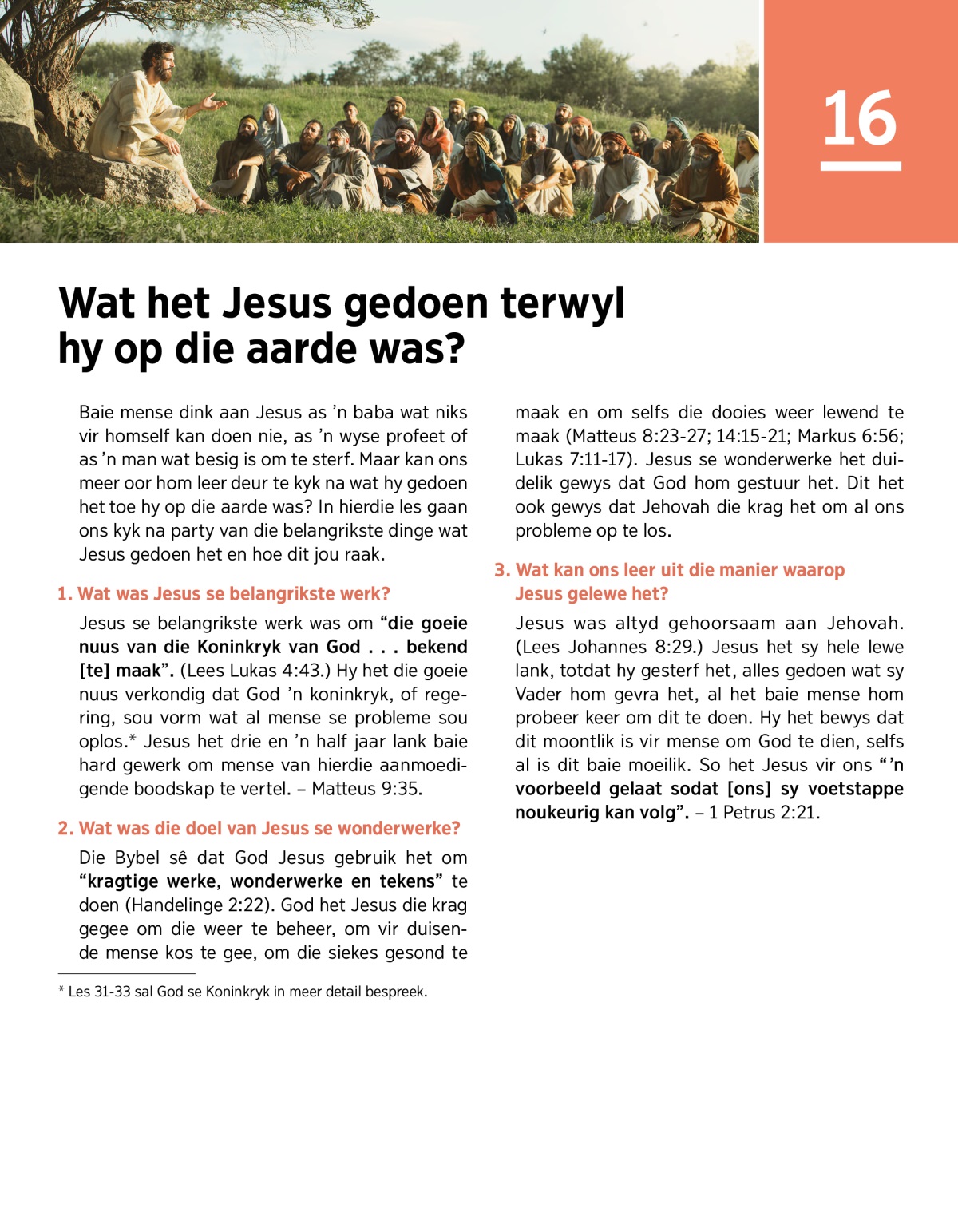 Jesus het mense van God se Koninkryk vertel, het wonderwerke gedoen en was altyd gehoorsaam aan Jehovah.