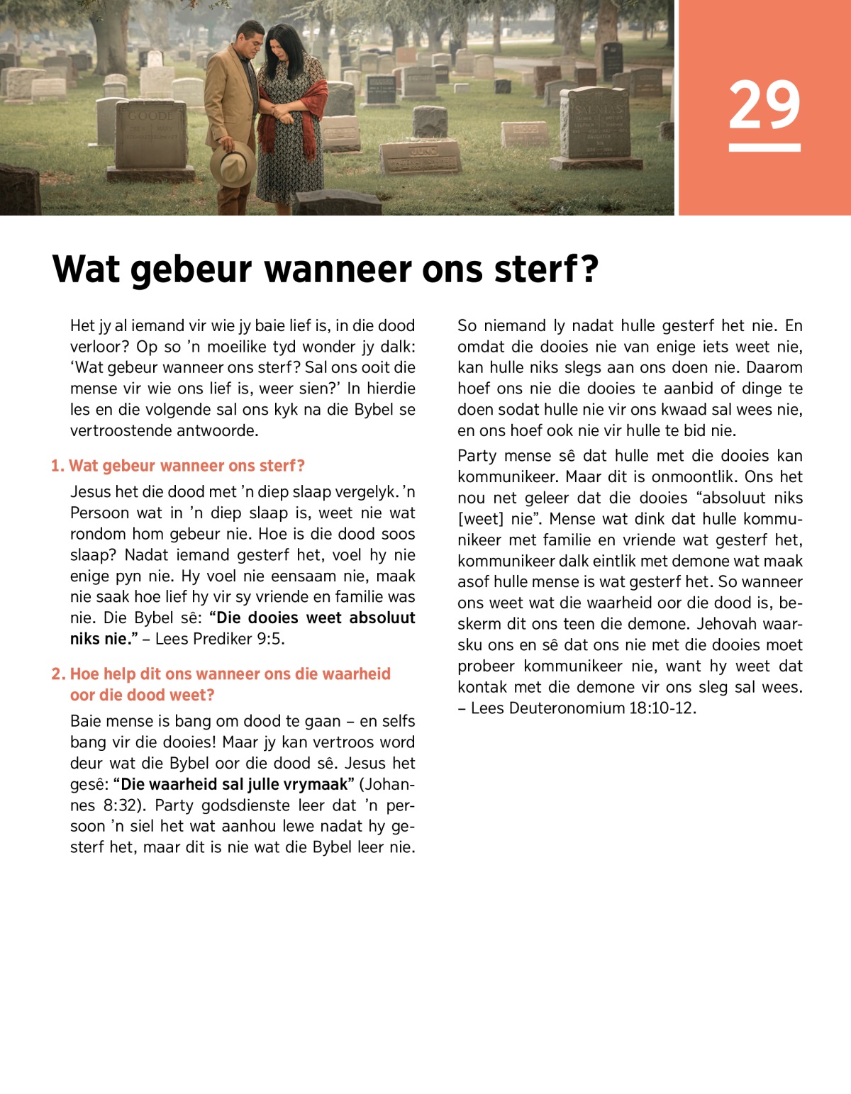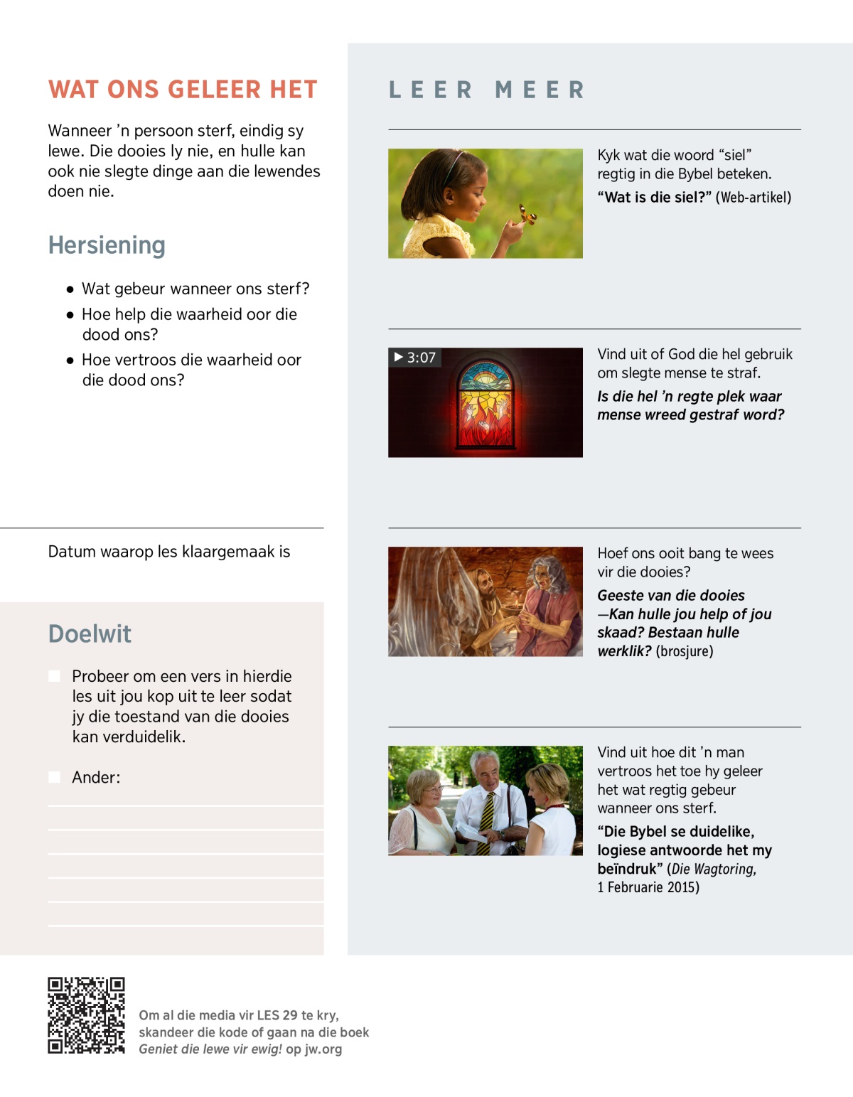 Het jy al iemand vir wie jy baie lief is, in die dood verloor? Op so ’n moeilike tyd wonder jy dalk: ‘Wat gebeur wanneer ons sterf? Sal ons ooit die mense vir wie ons lief is, weer sien?’ In hierdie les en die volgende sal ons kyk na die Bybel se vertroostende antwoorde.