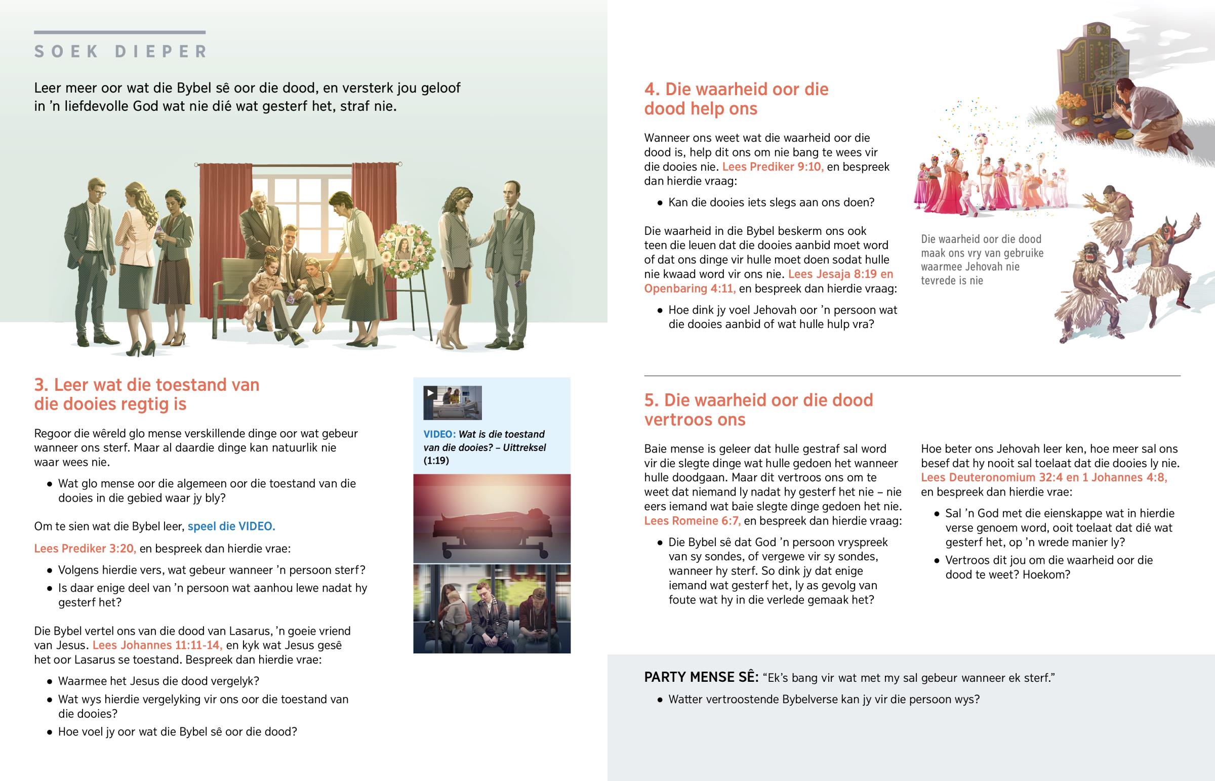Baie mense is bang om dood te gaan – en selfs bang vir die dooies! Maar jy kan vertroos word deur wat die Bybel oor die dood sê. Jesus het gesê: “Die waarheid sal julle vrymaak” (Johannes 8:32). Party godsdienste leer dat ’n persoon ’n siel het wat aanhou lewe nadat hy gesterf het, maar dit is nie wat die Bybel leer nie. So niemand ly nadat hulle gesterf het nie. En omdat die dooies nie van enige iets weet nie, kan hulle niks slegs aan ons doen nie. Daarom hoef ons nie die dooies te aanbid of dinge te doen sodat hulle nie vir ons kwaad sal wees nie, en ons hoef ook nie vir hulle te bid nie.