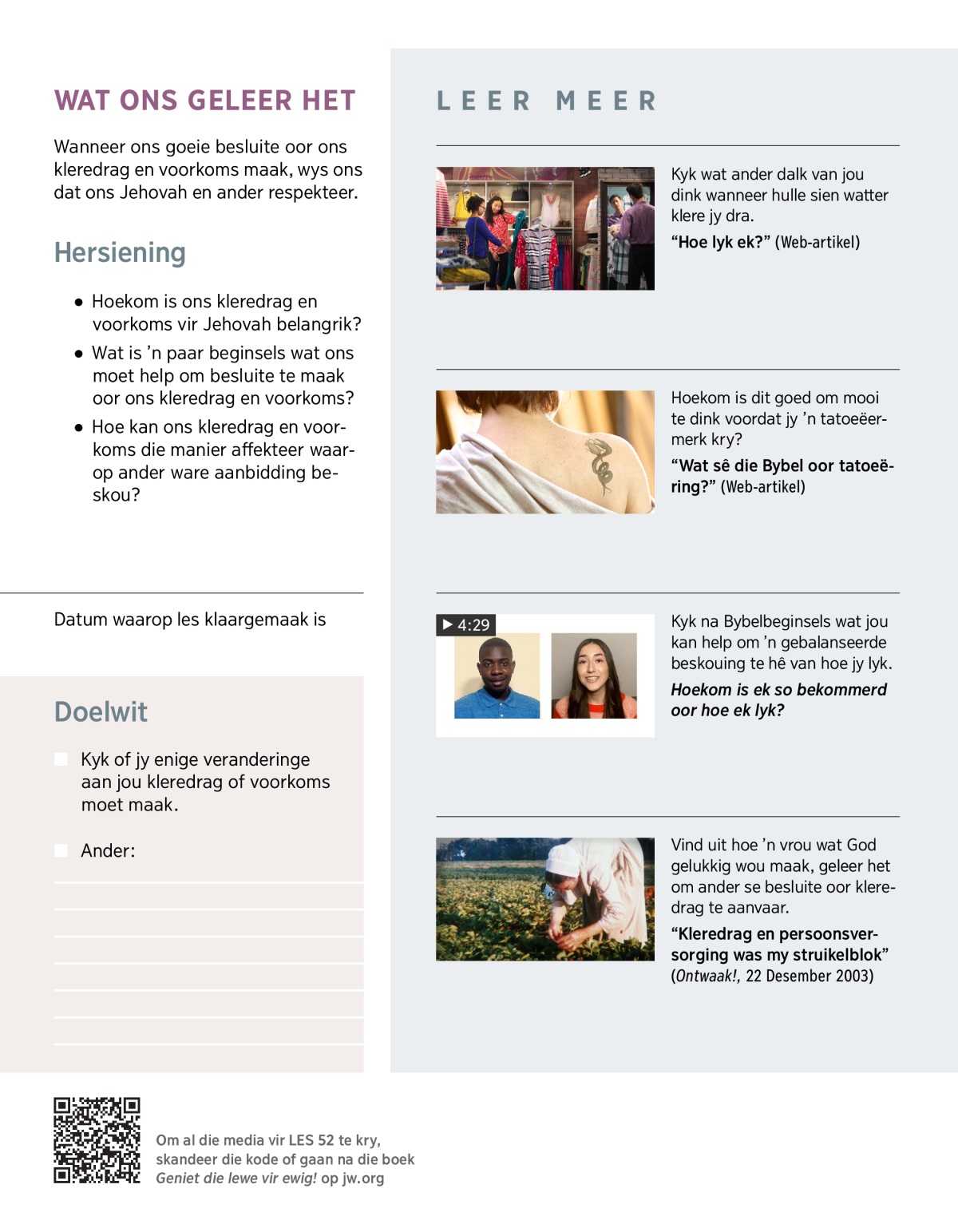 Ons moet “gepaste klere . . . met beskeidenheid en gesonde verstand” kies, en ons klere moet altyd skoon wees sodat ander kan sien dat ons “aan God toegewyd is” (1 Timoteus 2:9, 10). Kyk na hierdie vier beginsels: (1) Ons kleredrag moet ‘gepas’ wees. Jy het seker al by die vergadering gesien dat Jehovah se aanbidders op verskillende maniere aantrek, maar ons kleredrag en haarstyle wys altyd dat ons die God wat ons aanbid, respekteer. (2) Om “met beskeidenheid” aan te trek, beteken dat ons nie seksueel uitlokkende klere sal dra nie, en ook nie klere wat te veel aandag trek nie. (3) Ons wys dat ons “gesonde verstand” het wanneer ons nie elke styl of mode volg wat gewild word nie. (4) Ons voorkoms moet altyd wys dat ons “aan God toegewyd is” sodat ander maklik kan sien dat ons die ware God aanbid. – 1 Korintiërs 10:31.