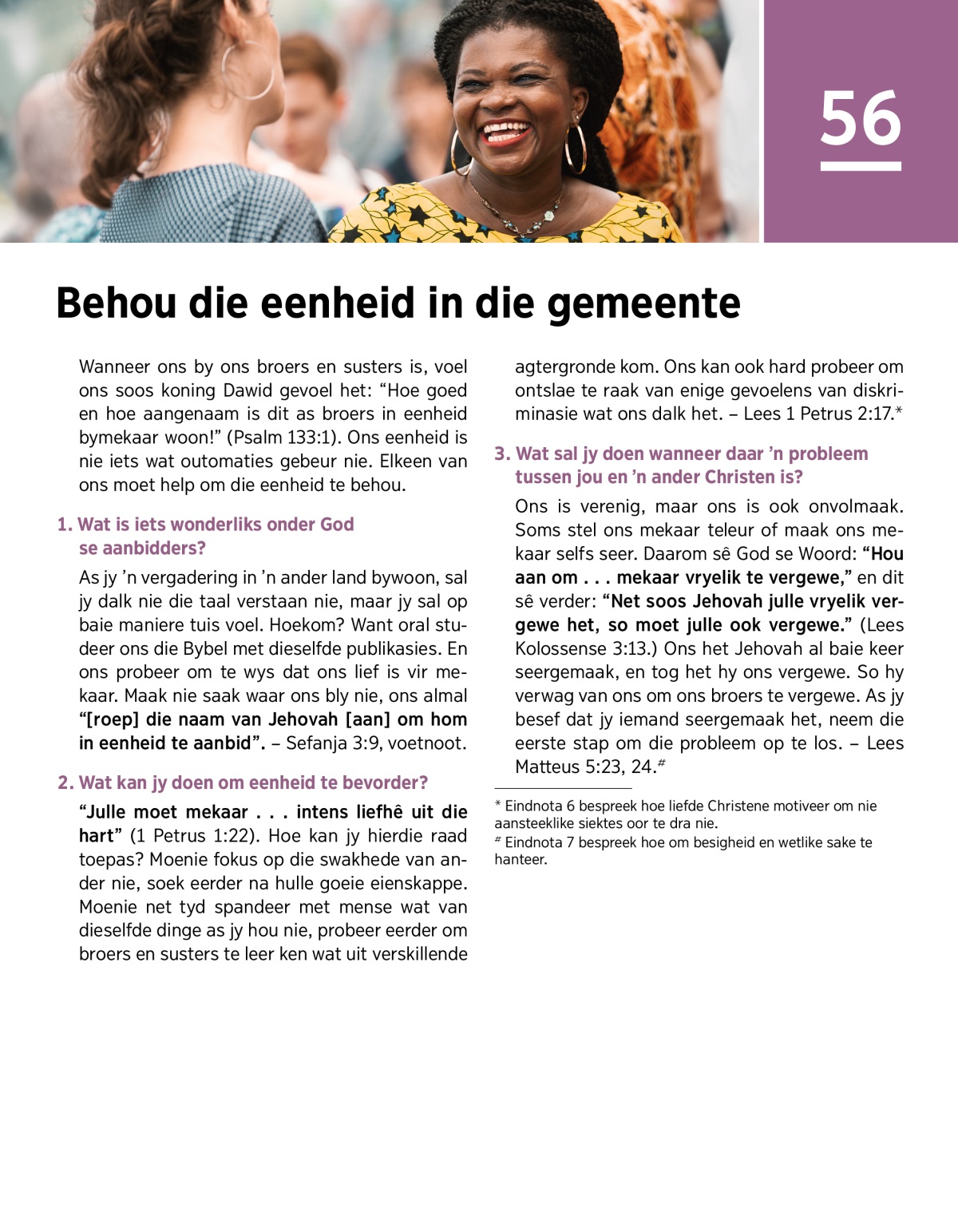 “Julle moet mekaar . . . intens liefhê uit die hart” (1 Petrus 1:22). Hoe kan jy hierdie raad toepas? Moenie fokus op die swakhede van ander nie, soek eerder na hulle goeie eienskappe. Moenie net tyd spandeer met mense wat van dieselfde dinge as jy hou nie, probeer eerder om broers en susters te leer ken wat uit verskillende agtergronde kom. Ons kan ook hard probeer om ontslae te raak van enige gevoelens van diskriminasie wat ons dalk het. – Lees 1 Petrus 2:17.a