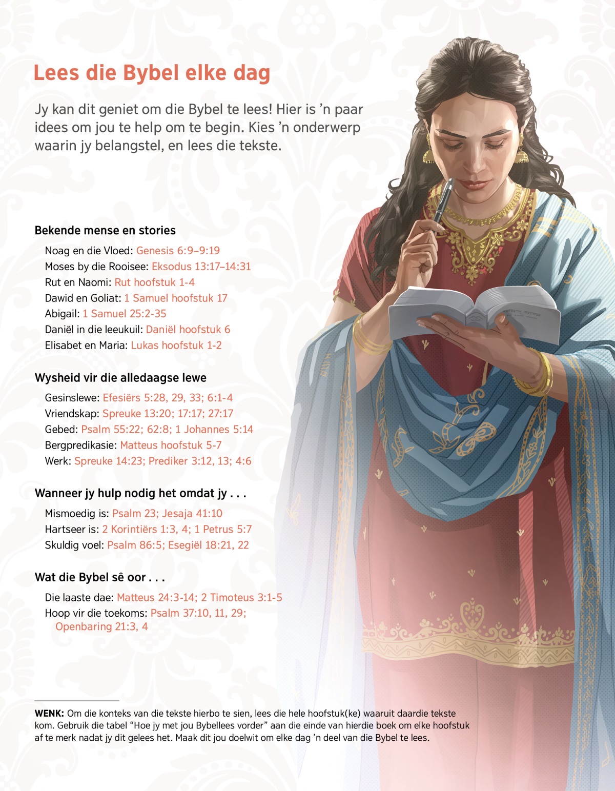 WENK: Om die konteks van die tekste hierbo te sien, lees die hele hoofstuk(ke) waaruit daardie tekste kom. Gebruik die tabel “Hoe jy met jou Bybellees vorder” aan die einde van hierdie boek om elke hoofstuk af te merk nadat jy dit gelees het. Maak dit jou doelwit om elke dag ’n deel van die Bybel te lees.