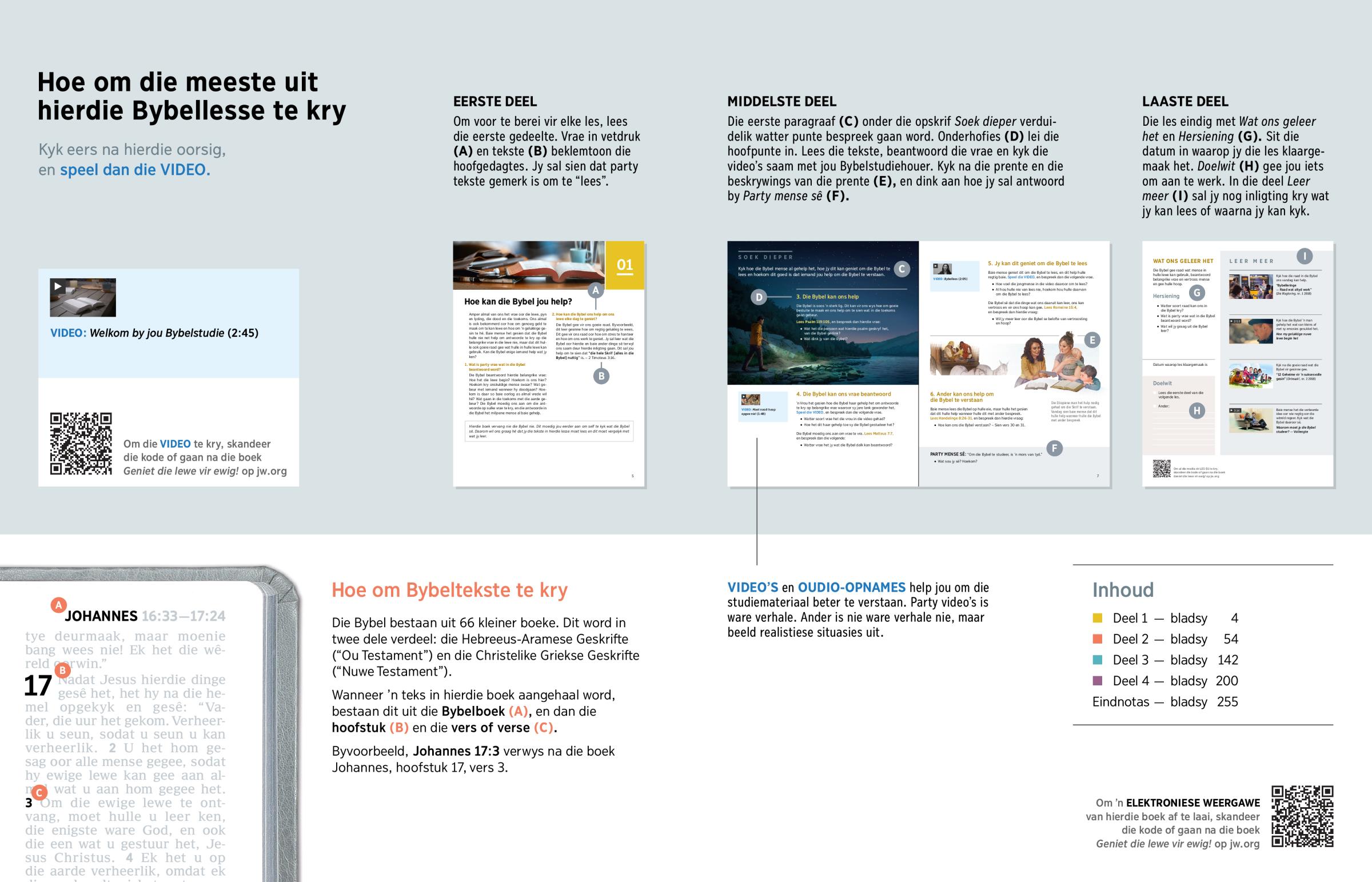 Om voor te berei vir elke les, lees die eerste gedeelte. Vrae in vetdruk (A) en tekste (B) beklemtoon die hoofgedagtes. Jy sal sien dat party tekste gemerk is om te “lees”.
