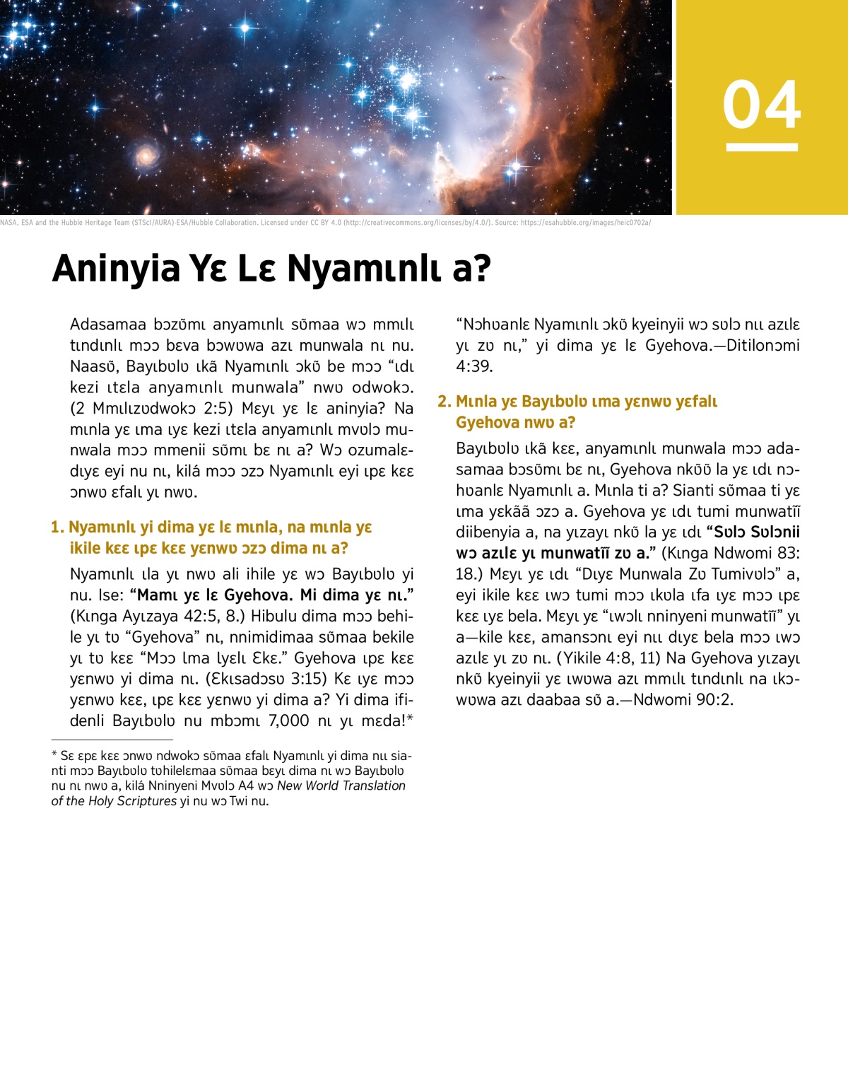 a Sɛ ɛpɛ kɛɛ ɔnwʋ ndwokɔ sʋ̃maa ɛfalɩ Nyamɩnlɩ yi dima nɩɩ sianti mɔɔ Bayɩbʋlʋ tʋhilelɛmaa sʋ̃maa bɛyɩ dima nɩ wɔ Bayɩbʋlʋ nu nɩ nwʋ a, kilá Nninyeni Mvʋlɔ A4 wɔ New World Translation of the Holy Scriptures yi nu wɔ Twi nu.