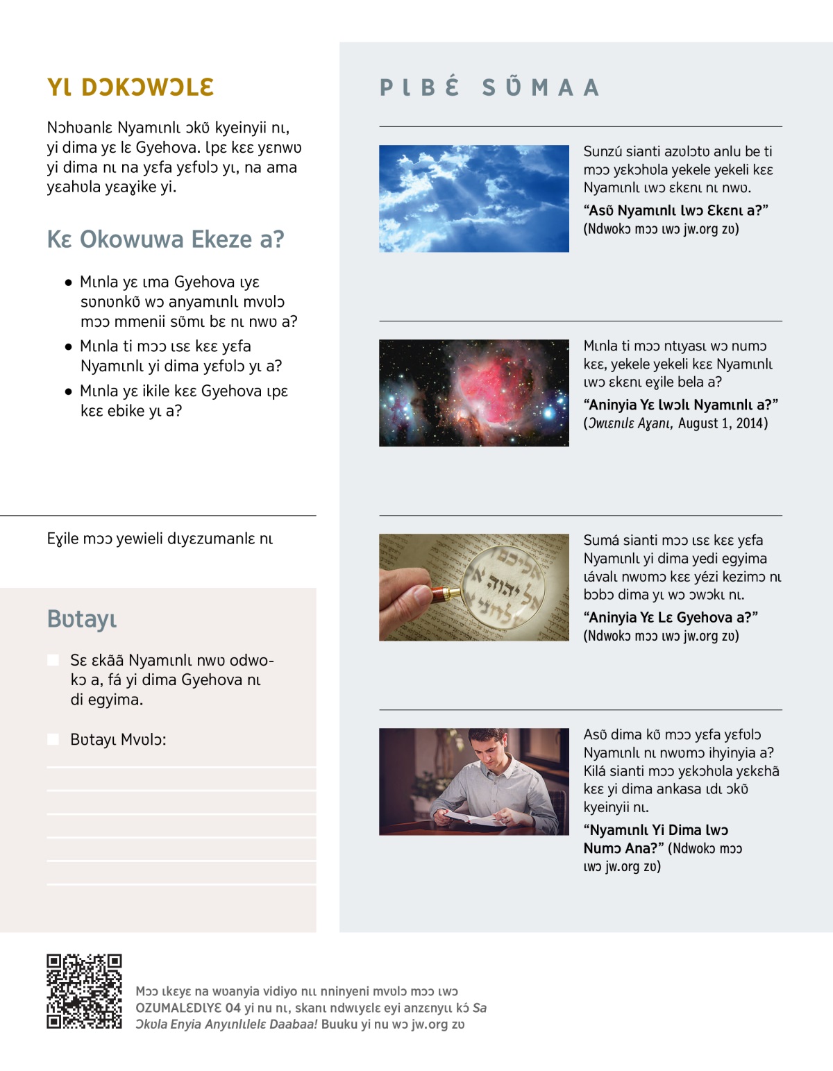 “Aninyia Yɛ Ɩwɔlɩ Nyamɩnlɩ a?” (Ɔwɩɛnɩlɛ Aɣanɩ, August 1, 2014)