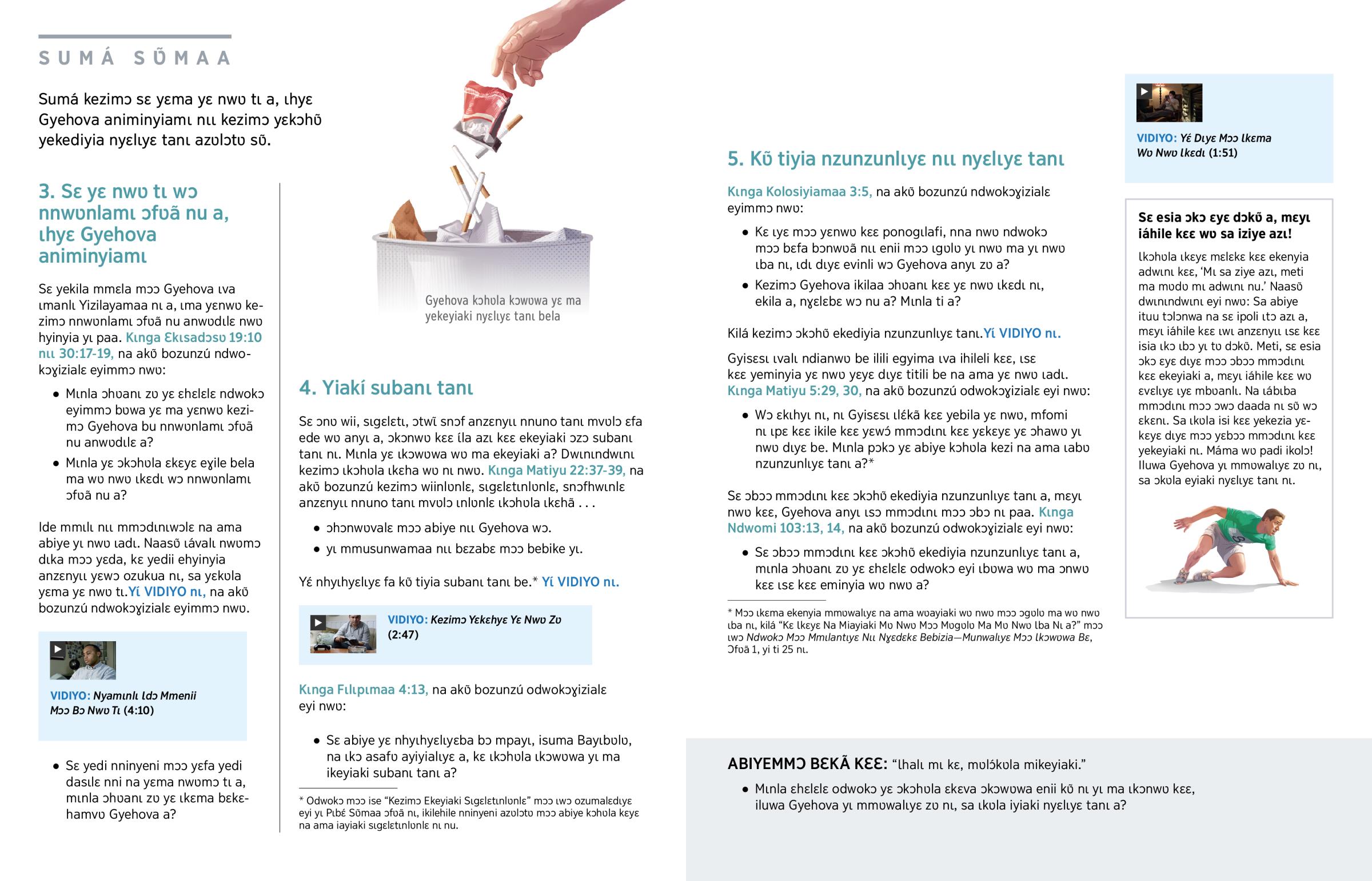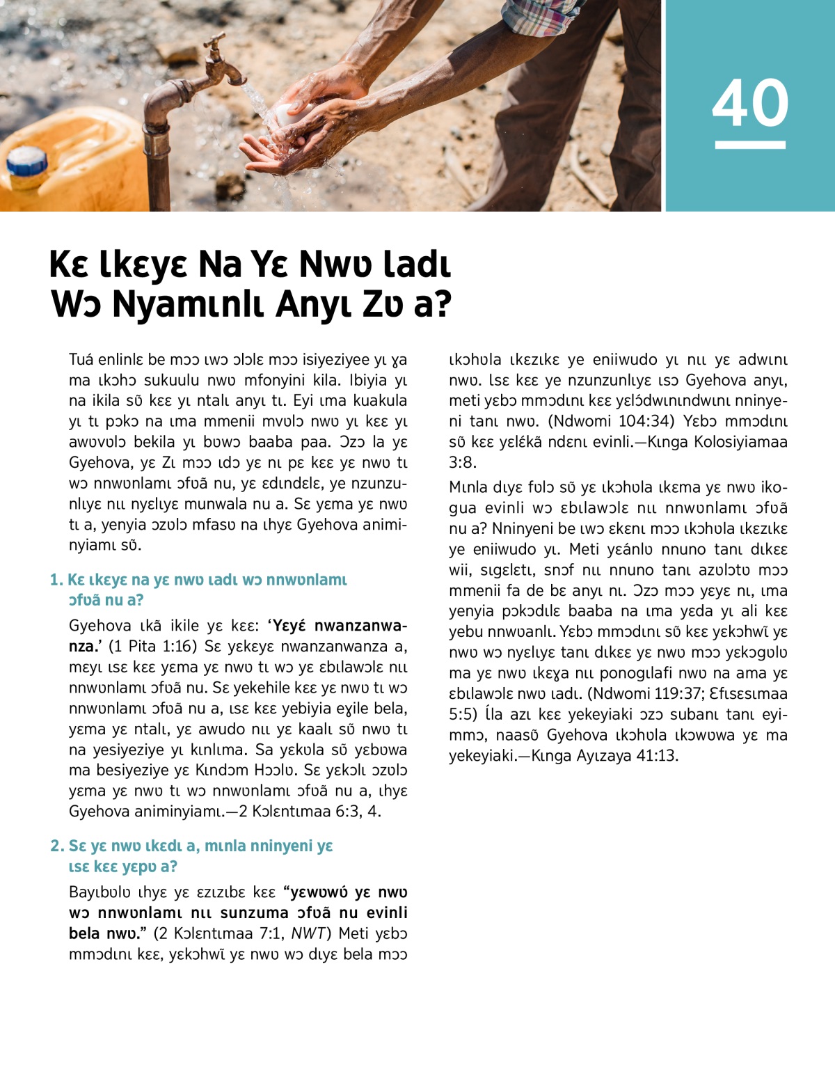 b Mɔɔ ɩkɛma ekenyia mmʋwalɩyɛ na ama wʋayiaki wʋ nwʋ mɔɔ ɔgʋlʋ ma wʋ nwʋ ɩba nɩ, kilá “Kɛ Ɩkɛyɛ Na Miayiaki Mʋ Nwʋ Mɔɔ Mʋgʋlʋ Ma Mʋ Nwʋ Ɩba Nɩ a?” mɔɔ ɩwɔ Ndwokɔ Mɔɔ Mmɩlantɩyɛ Nɩɩ Nɣɛdɛkɛ Bebizia—Munwalɩyɛ Mɔɔ Ɩkɔwʋwa Bɛ, Ɔfʋã 1, yi ti 25 nɩ.