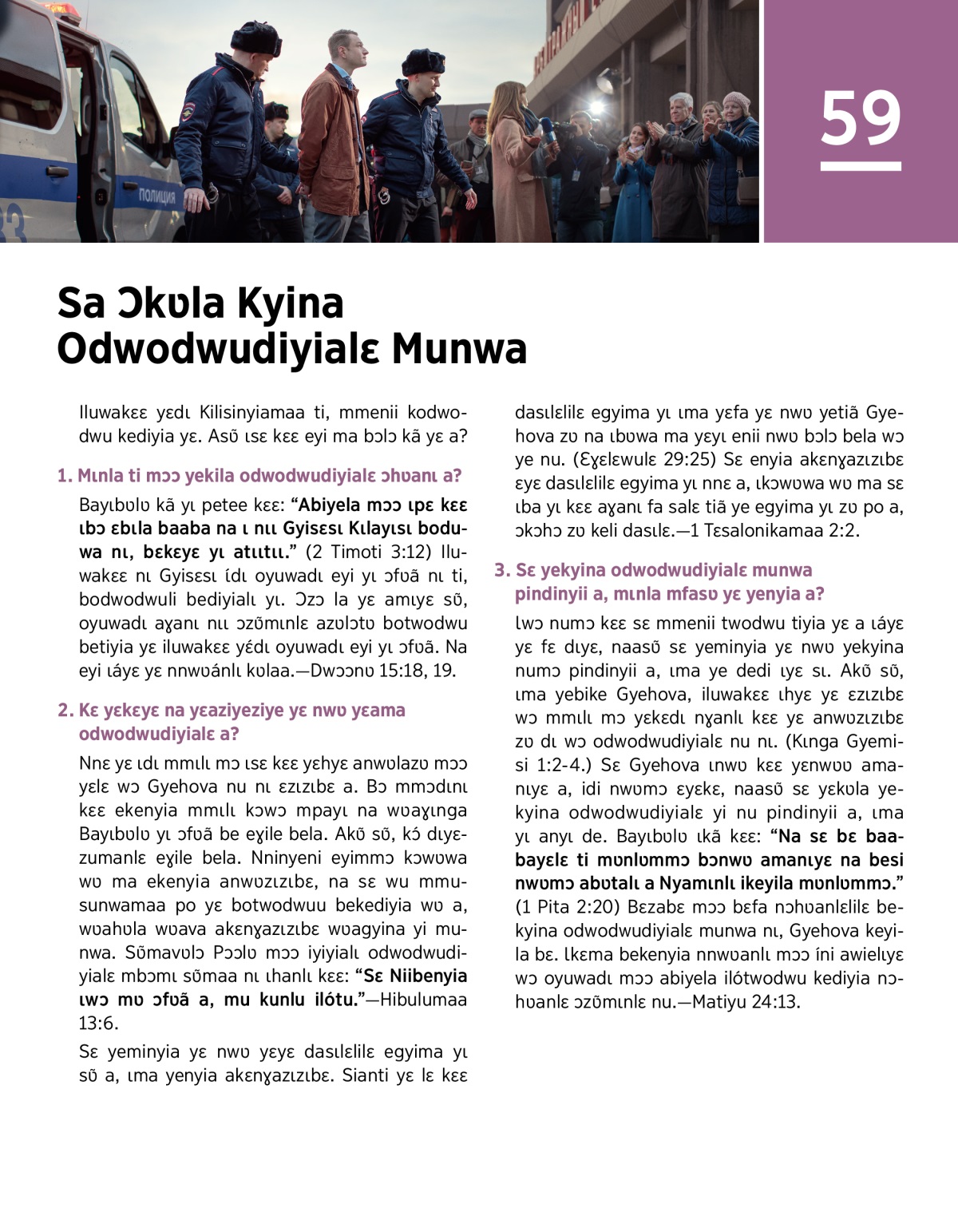 Ɩwɔ numɔ kɛɛ sɛ mmenii twodwu tiyia yɛ a ɩáyɛ yɛ fɛ dɩyɛ, naasʋ̃ sɛ yeminyia yɛ nwʋ yekyina numɔ pindinyii a, ɩma ye dedi ɩyɛ sɩ. Akʋ̃ sʋ̃, ɩma yebike Gyehova, iluwakɛɛ ɩhyɛ yɛ ɛzɩzɩbɛ wɔ mmɩlɩ mɔ yɛkɛdɩ nɣanlɩ kɛɛ yɛ anwʋzɩzɩbɛ zʋ dɩ wɔ odwodwudiyialɛ nu nɩ. (Kɩnga Gyemisi 1:2-4.) Sɛ Gyehova ɩnwʋ kɛɛ yɛnwʋʋ amanɩyɛ a, idi nwʋmɔ ɛyɛkɛ, naasʋ̃ sɛ yɛkʋla yekyina odwodwudiyialɛ yi nu pindinyii a, ɩma yɩ anyɩ de. Bayɩbʋlʋ ɩkã kɛɛ: “Na sɛ bɛ baabayɛlɛ ti mʋnlʋmmɔ bɔnwʋ amanɩyɛ na besi nwʋmɔ abʋtalɩ a Nyamɩnlɩ ikeyila mʋnlʋmmɔ.” (1 Pita 2:20) Bɛzabɛ mɔɔ bɛfa nɔhʋanlɛlilɛ bekyina odwodwudiyialɛ munwa nɩ, Gyehova keyila bɛ. Ɩkɛma bekenyia nnwʋanlɩ mɔɔ íni awielɩyɛ wɔ oyuwadɩ mɔɔ abiyela ilótwodwu kediyia nɔhʋanlɛ ɔzʋ̃mɩnlɛ nu.—Matiyu 24:13.