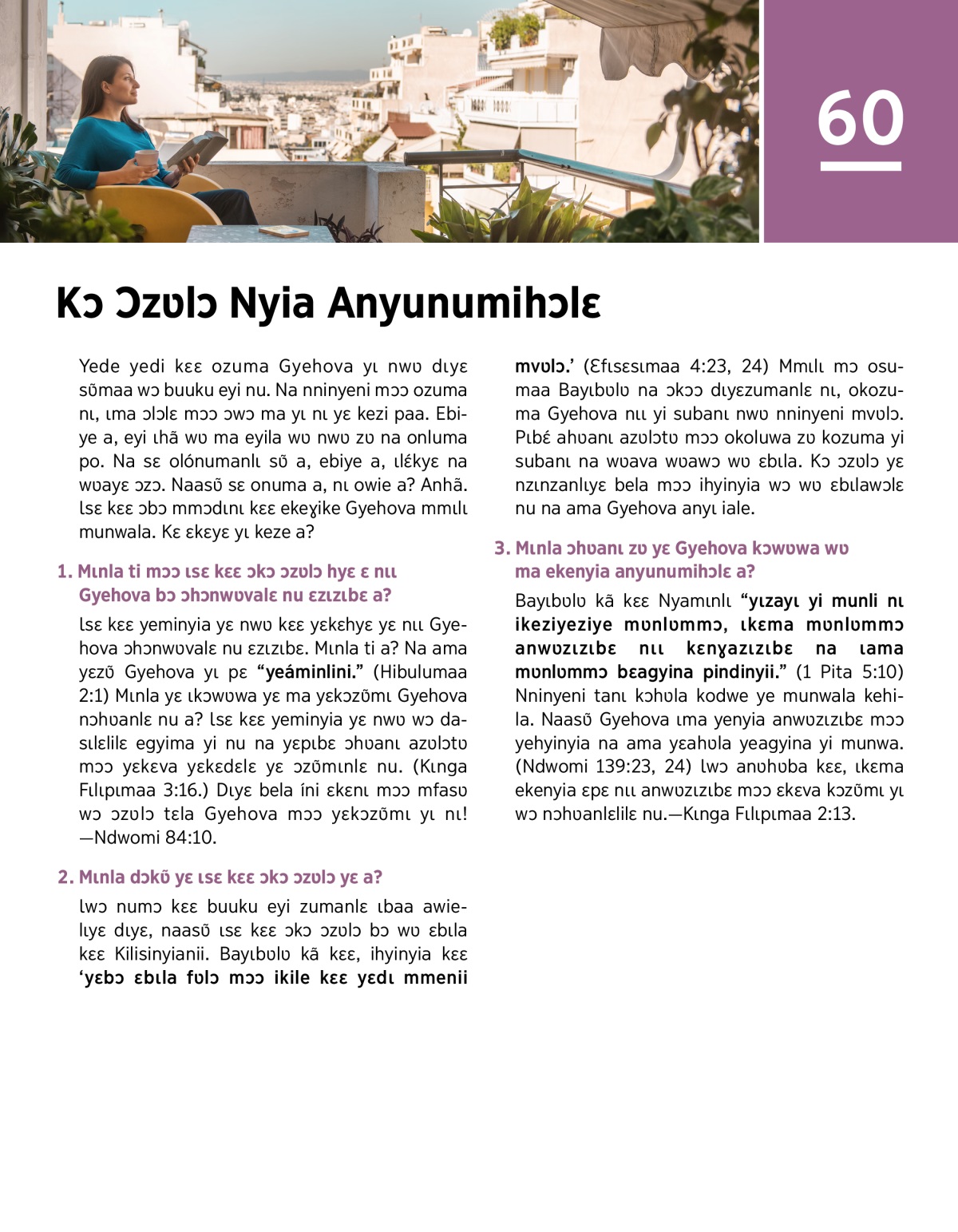 Yede yedi kɛɛ ozuma Gyehova yɩ nwʋ dɩyɛ sʋ̃maa wɔ buuku eyi nu. Na nninyeni mɔɔ ozuma nɩ, ɩma ɔlɔlɛ mɔɔ ɔwɔ ma yɩ nɩ yɛ kezi paa. Ebiye a, eyi ɩhã wʋ ma eyila wʋ nwʋ zʋ na onluma po. Na sɛ olónumanlɩ sʋ̃ a, ebiye a, ɩlɛ́kyɛ na wʋayɛ ɔzɔ. Naasʋ̃ sɛ onuma a, nɩ owie a? Anhã. Ɩsɛ kɛɛ ɔbɔ mmɔdɩnɩ kɛɛ ekeɣike Gyehova mmɩlɩ munwala. Kɛ ɛkɛyɛ yɩ keze a?