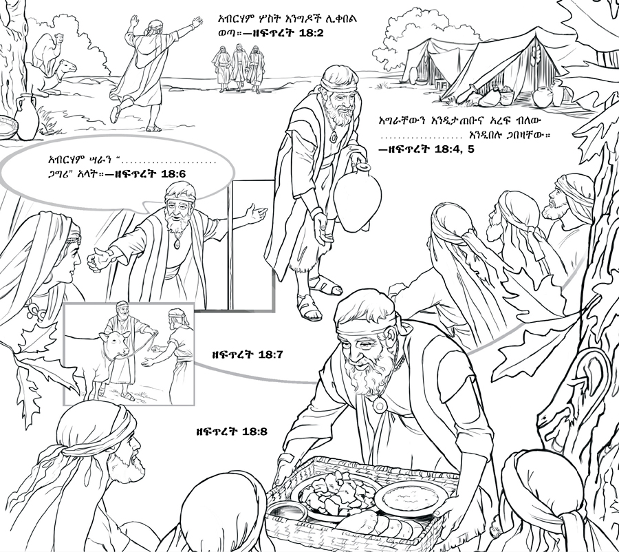 • ሥዕሎቹን ተስማሚ ቀለም ቀባ። • ጥቅሶቹን አንብብና አብራራ፤ ከዚያም የተናገሩትን ነገር በክፍት ቦታው ላይ ጻፍ። • እስቲ የሚከተሉትን ነገሮች ከሥዕሎቹ ውስጥ ፈልገህ ለማግኘት ሞክር። (1) እንሽላሊት እና (2) ቢላዋ