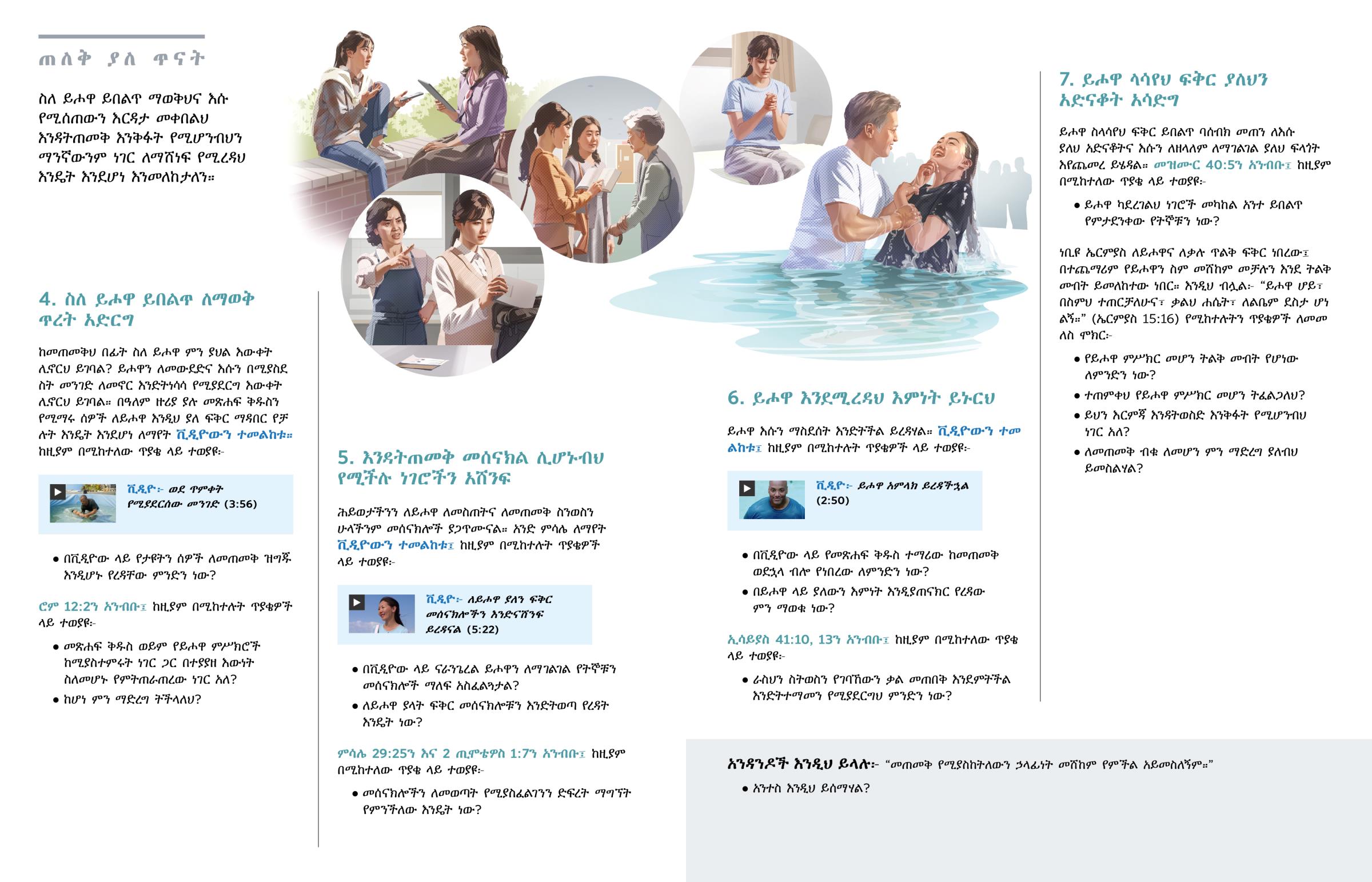 ከመጠመቅህ በፊት ስለ ይሖዋ ምን ያህል እውቀት ሊኖርህ ይገባል? ይሖዋን ለመውደድና እሱን በሚያስደስት መንገድ ለመኖር እንድትነሳሳ የሚያደርግ እውቀት ሊኖርህ ይገባል። በዓለም ዙሪያ ያሉ መጽሐፍ ቅዱስን የሚማሩ ሰዎች ለይሖዋ እንዲህ ያለ ፍቅር ማዳበር የቻሉት እንዴት እንደሆነ ለማየት ቪዲዮውን ተመልከቱ። ከዚያም በሚከተለው ጥያቄ ላይ ተወያዩ፦