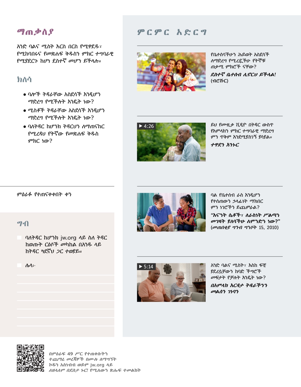 ፍጹም የሆነ ትዳር የለም። በመሆኑም ባለትዳሮች የሚያጋጥሟቸውን ችግሮች ለመፍታት ተባብረው መሥራት ይኖርባቸዋል። ቪዲዮውን ተመልከቱ፤ ከዚያም በሚከተሉት ጥያቄዎች ላይ ተወያዩ፦