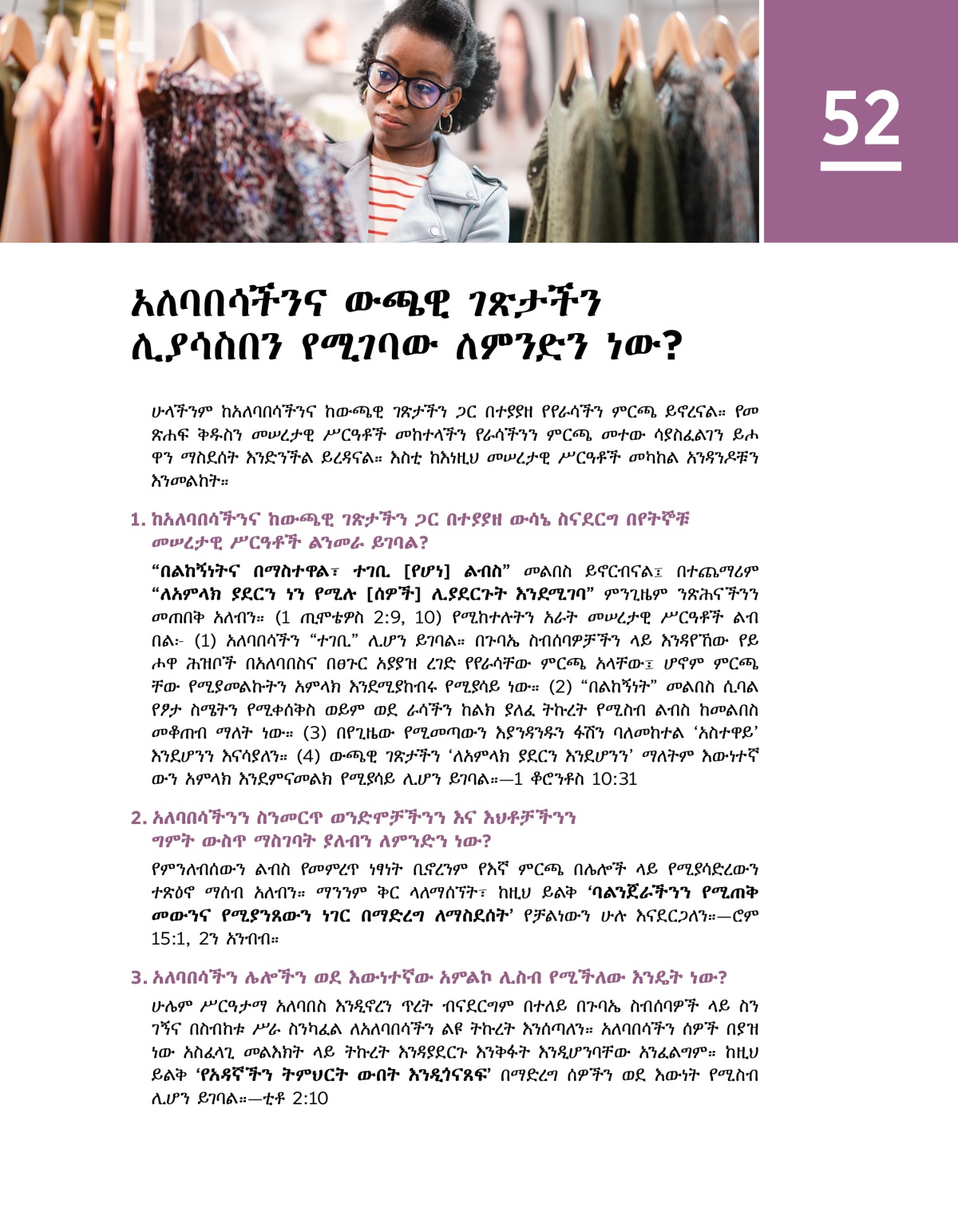 1. ከአለባበሳችንና ከውጫዊ ገጽታችን ጋር በተያያዘ ውሳኔ ስናደርግ በየትኞቹ መሠረታዊ ሥርዓቶች ልንመራ ይገባል?