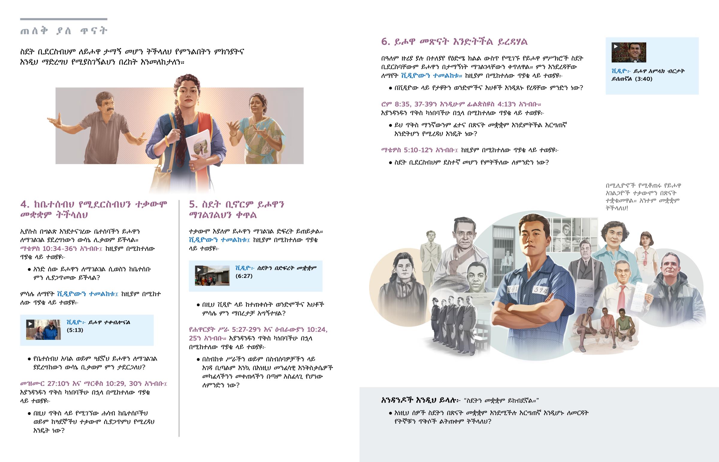 በዓለም ዙሪያ ያሉ በተለያየ የዕድሜ ክልል ውስጥ የሚገኙ የይሖዋ ምሥክሮች ስደት ቢደርስባቸውም ይሖዋን በታማኝነት ማገልገላቸውን ቀጥለዋል። ምን እንደረዳቸው ለማየት ቪዲዮውን ተመልከቱ። ከዚያም በሚከተለው ጥያቄ ላይ ተወያዩ፦