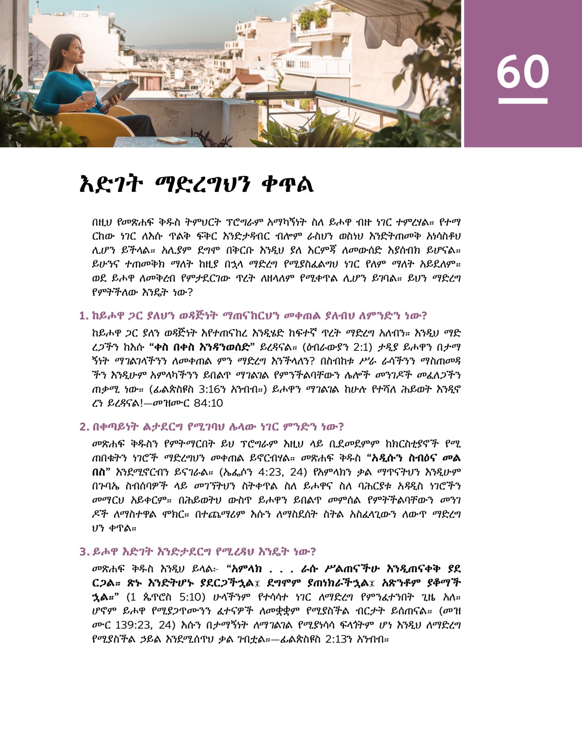 ምዕራፍ 60. አንዲት ሴት በረንዳዋ ላይ ቁጭ ብላ መጽሐፍ ቅዱስ ስታነብ። ከጎኗ ያለው ጠረጴዛ ላይ ‘ወደ ይሖዋ ቅረብ’ የተባለው መጽሐፍ ተቀምጧል