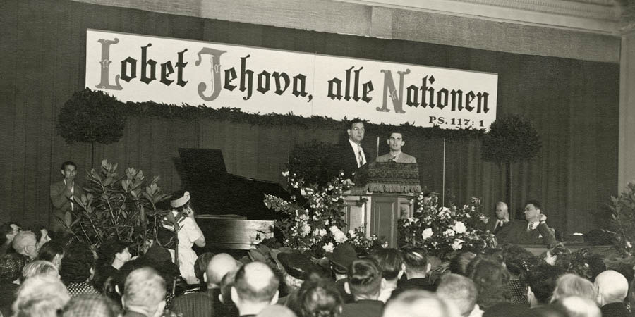 በ1947 ወንድም ናታን ኖር በቪስባደን፣ ጀርመን ላሉ ወንድሞች ንግግር ሲያቀርብ። ከበላዩ “ብሔራት ሁሉ፣ ይሖዋን አወድሱት” የሚለው የዓመት ጥቅስ በጀርመንኛ ተጽፏል