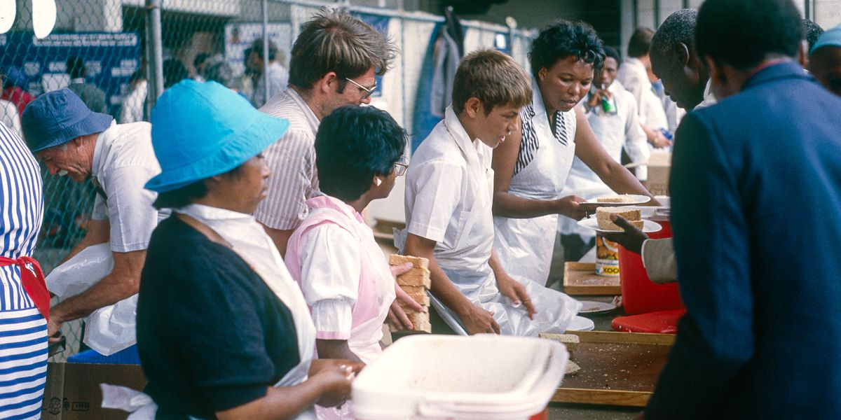 በ1985 የተለያየ ዘር ያላቸው የይሖዋ ምሥክሮች በአንድ ትልቅ ስብሰባ ላይ ምግብ ሲያቀርቡ