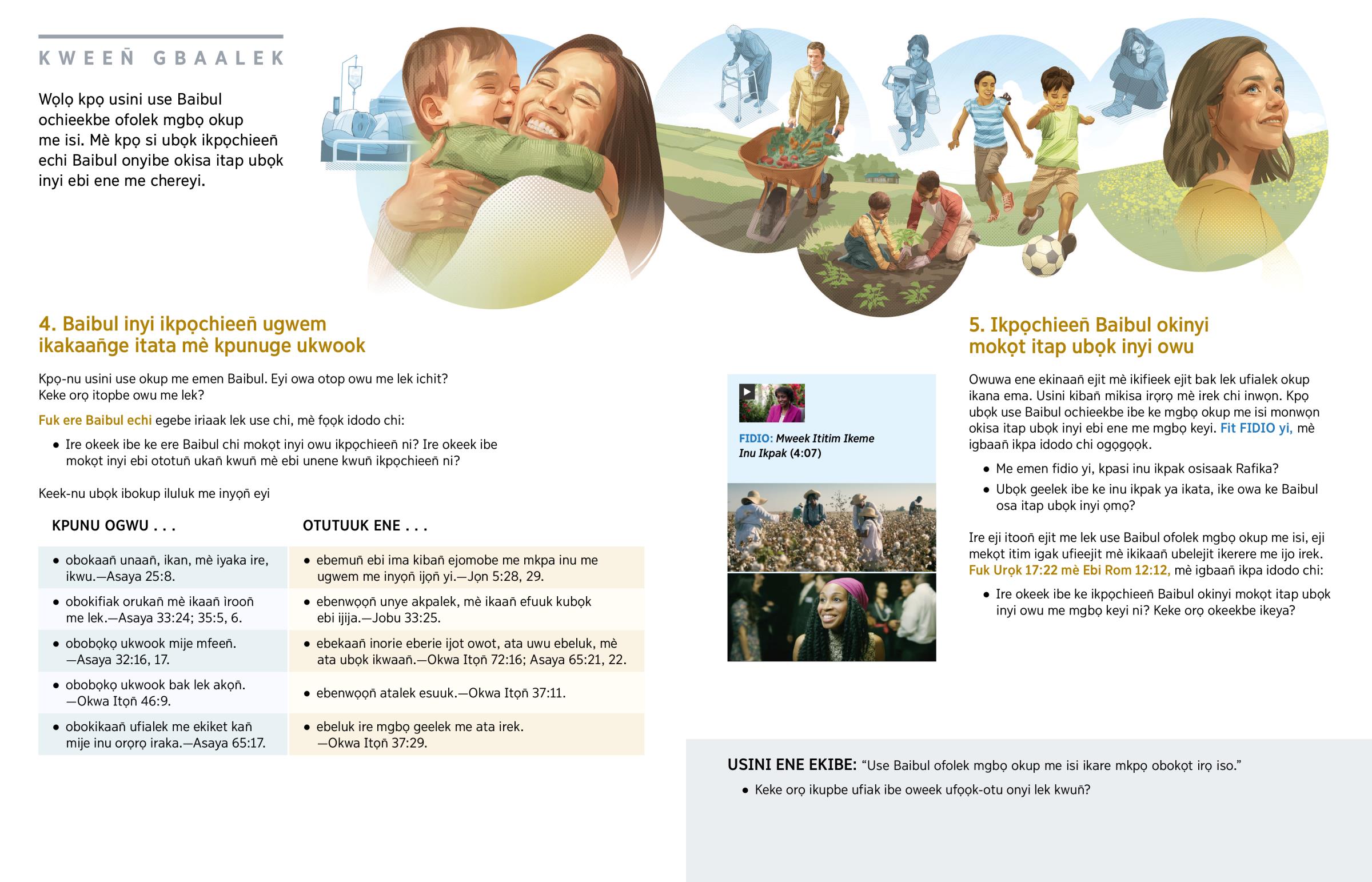 Owuwa ene ekinaan̄ ejit mè ikifieek ejit bak lek ufialek okup ikana ema. Usini kiban̄ mikisa irọrọ mè irek chi inwọn. Kpọ ubọk use Baibul ochieekbe ibe ke mgbọ okup me isi monwọn okisa itap ubọk inyi ebi ene me mgbọ keyi. Fit FIDIO yi, mè igbaan̄ ikpa idodo chi ogọgọọk.