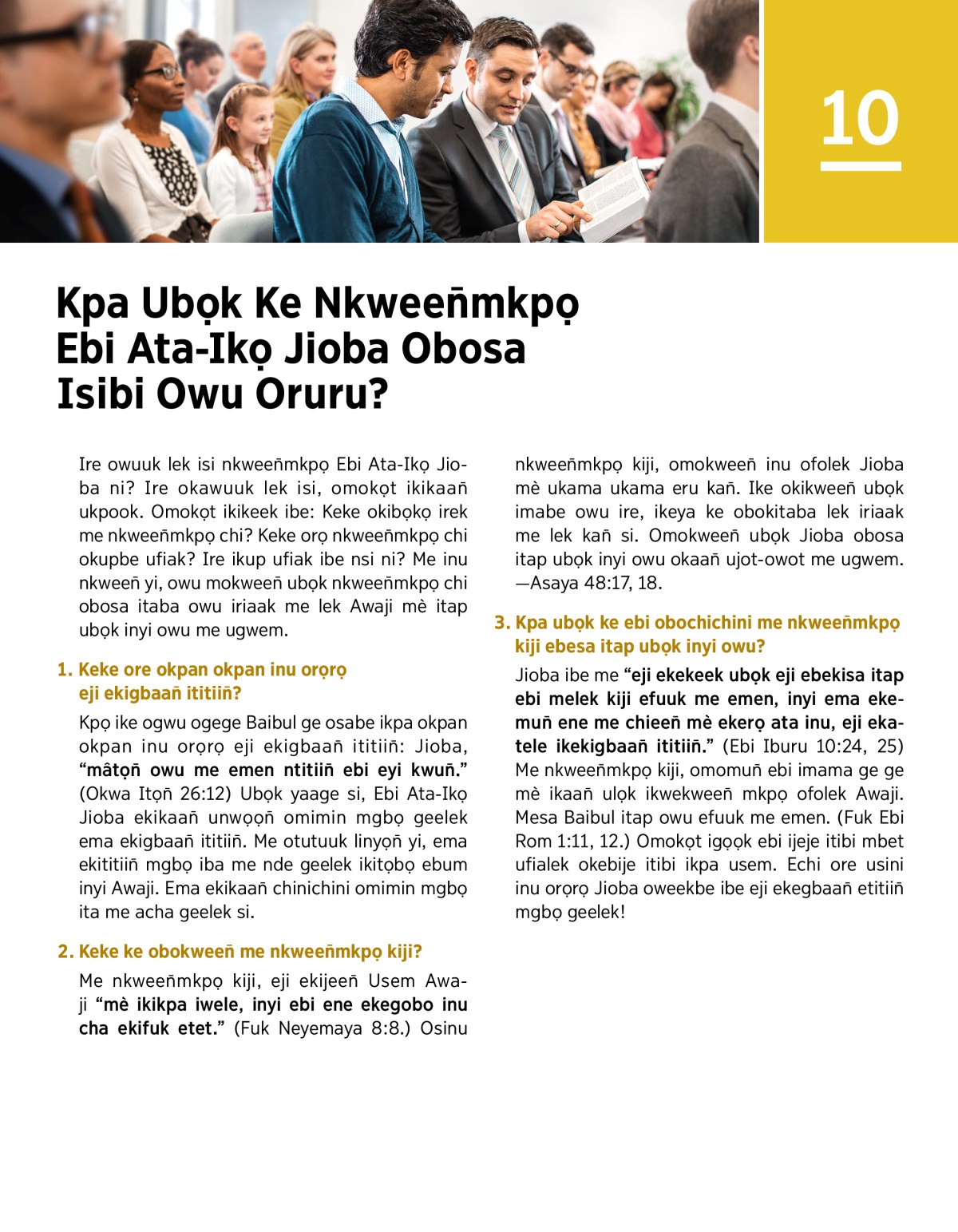 Me nkween̄mkpọ kiji, eji ekijeen̄ Usem Awaji “mè ikikpa iwele, inyi ebi ene ekegobo inu cha ekifuk etet.” (Fuk Neyemaya 8:8.) Osinu nkween̄mkpọ kiji, omokween̄ inu ofolek Jioba mè ukama ukama eru kan̄. Ike okikween̄ ubọk imabe owu ire, ikeya ke obokitaba lek iriaak me lek kan̄ si. Omokween̄ ubọk Jioba obosa itap ubọk inyi owu okaan̄ ujot-owot me ugwem.—Asaya 48:17, 18.