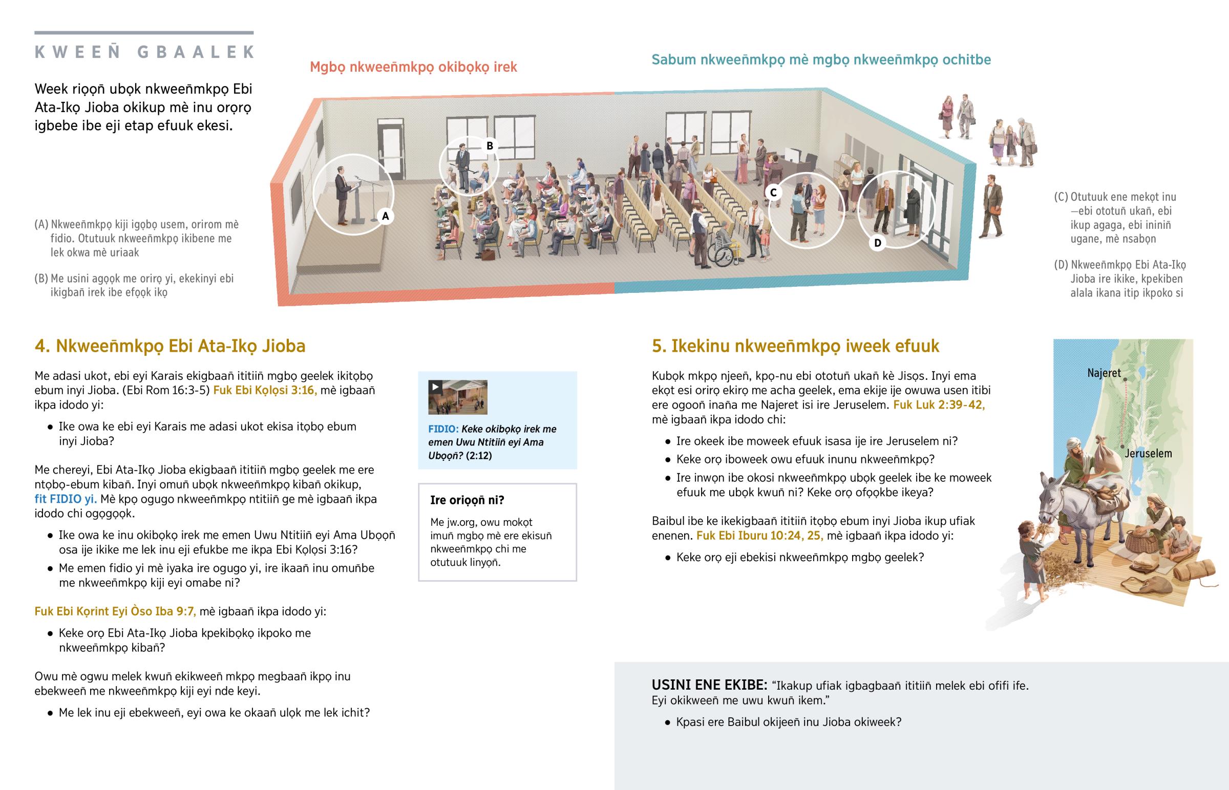 Jioba ibe me “eji ekekeek ubọk eji ebekisa itap ebi melek kiji efuuk me emen, inyi ema ekemun̄ ene me chieen̄ mè ekerọ ata inu, eji ekatele ikekigbaan̄ ititiin̄.” (Ebi Iburu 10:24, 25) Me nkween̄mkpọ kiji, omomun̄ ebi imama ge ge mè ikaan̄ ulọk ikwekween̄ mkpọ ofolek Awaji. Mesa Baibul itap owu efuuk me emen. (Fuk Ebi Rom 1:11, 12.) Omokọt igọọk ebi ijeje itibi mbet ufialek okebije itibi ikpa usem. Echi ore usini inu orọrọ Jioba oweekbe ibe eji ekegbaan̄ etitiin̄ mgbọ geelek!