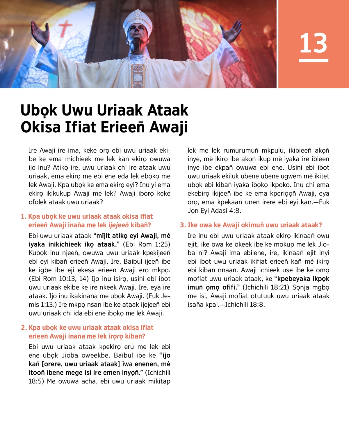 Ebi uwu uriaak ataak “mîjit atikọ eyi Awaji, mè iyaka inikichieek ikọ ataak.” (Ebi Rom 1:25) Kubọk inu njeen̄, owuwa uwu uriaak kpekijeen̄ ebi eyi kiban̄ erieen̄ Awaji. Ire, Baibul ijeen̄ ibe ke igbe ibe eji ekesa erieen̄ Awaji erọ mkpọ. (Ebi Rom 10:13, 14) Ijo inu isirọ, usini ebi ibot uwu uriaak ekibe ke ire nkeek Awaji. Ire, eya ire ataak. Ijo inu ikakinan̄a me ubọk Awaji. (Fuk Jemis 1:13.) Ire mkpọ nsan ibe ke ataak ijejeen̄ ebi uwu uriaak chi ida ebi ene ibọkọ me lek Awaji.