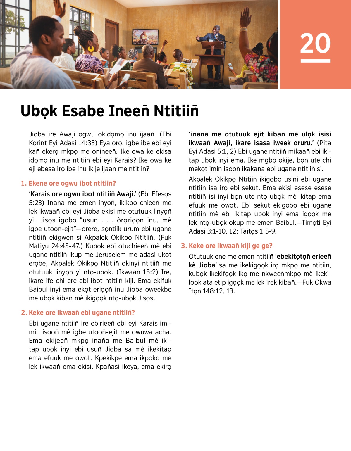 ‘Karais ore ogwu ibot ntitiin̄ Awaji.’ (Ebi Efesọs 5:23) Inan̄a me emen inyọn̄, ikikpọ chieen̄ me lek ikwaan̄ ebi eyi Jioba ekisi me otutuuk linyọn̄ yi. Jisọs igobo “usun̄ . . . òrọriọọn̄ inu, mè igbe utoon̄-ejit”—orere, sọntiik urum ebi ugane ntitiin̄ ekigwen si Akpalek Okikpọ Ntitiin̄. (Fuk Matiyu 24:45-47.) Kubọk ebi otuchieen̄ mè ebi ugane ntitiin̄ ikup me Jeruselem me adasi ukot erọbe, Akpalek Okikpọ Ntitiin̄ okinyi ntitiin̄ me otutuuk linyọn̄ yi ntọ-ubọk. (Ikwaan̄ 15:2) Ire, ikare ife chi ere ebi ibot ntitiin̄ kiji. Ema ekifuk Baibul inyi ema ekọt eriọọn̄ inu Jioba oweekbe me ubọk kiban̄ mè ikigọọk ntọ-ubọk Jisọs.