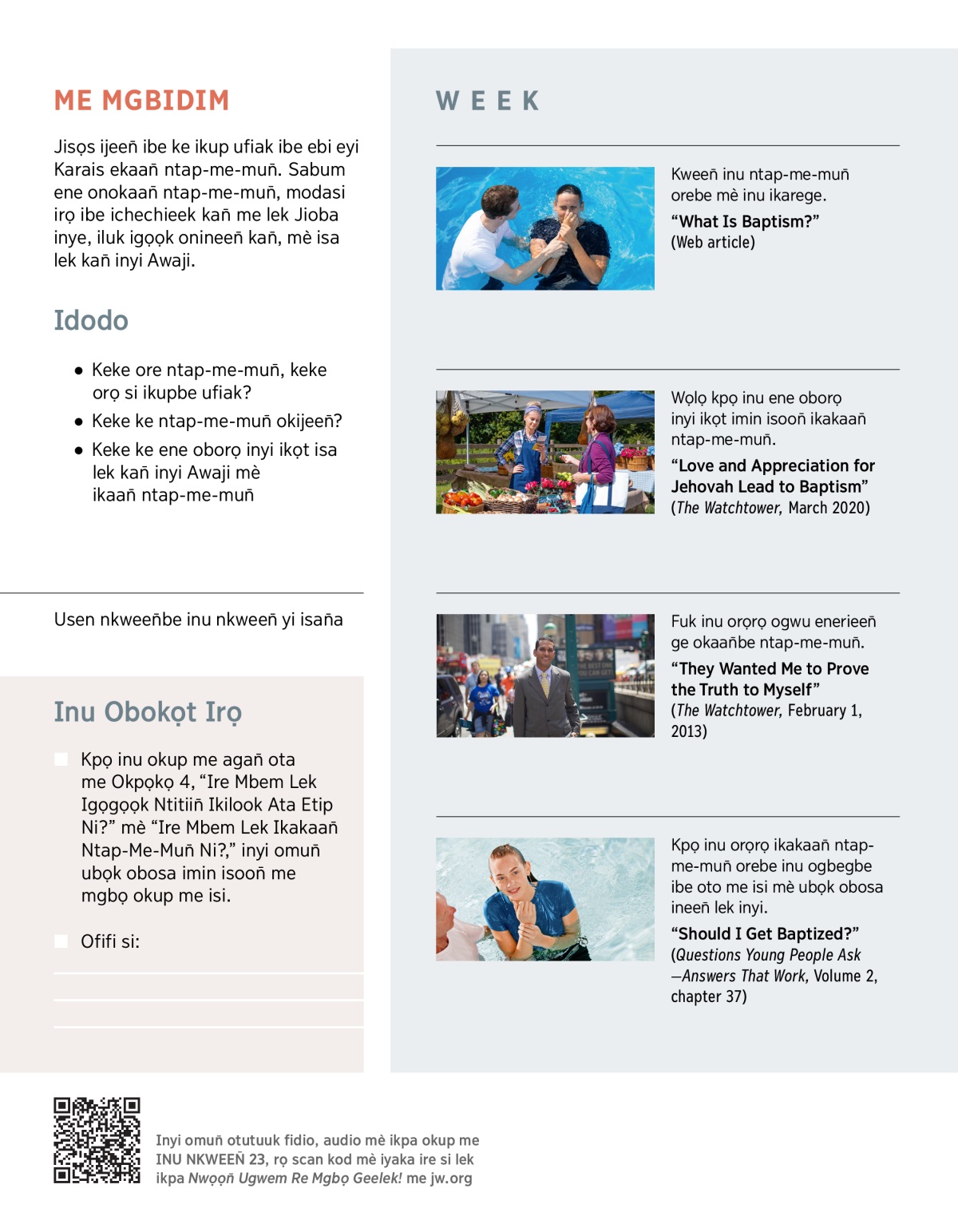 Jisọs ijeen̄ ibe ke ikakaan̄ ntap-me-mun̄ ire inu eweekbe me ubọk ebi eyi Karais. (Fuk Matiyu 28:19, 20) Ire, keke ore ntap-me-mun̄? Keke ke ene oborọ inyi imin isoon̄ ikakaan̄ ntap-me-mun̄?