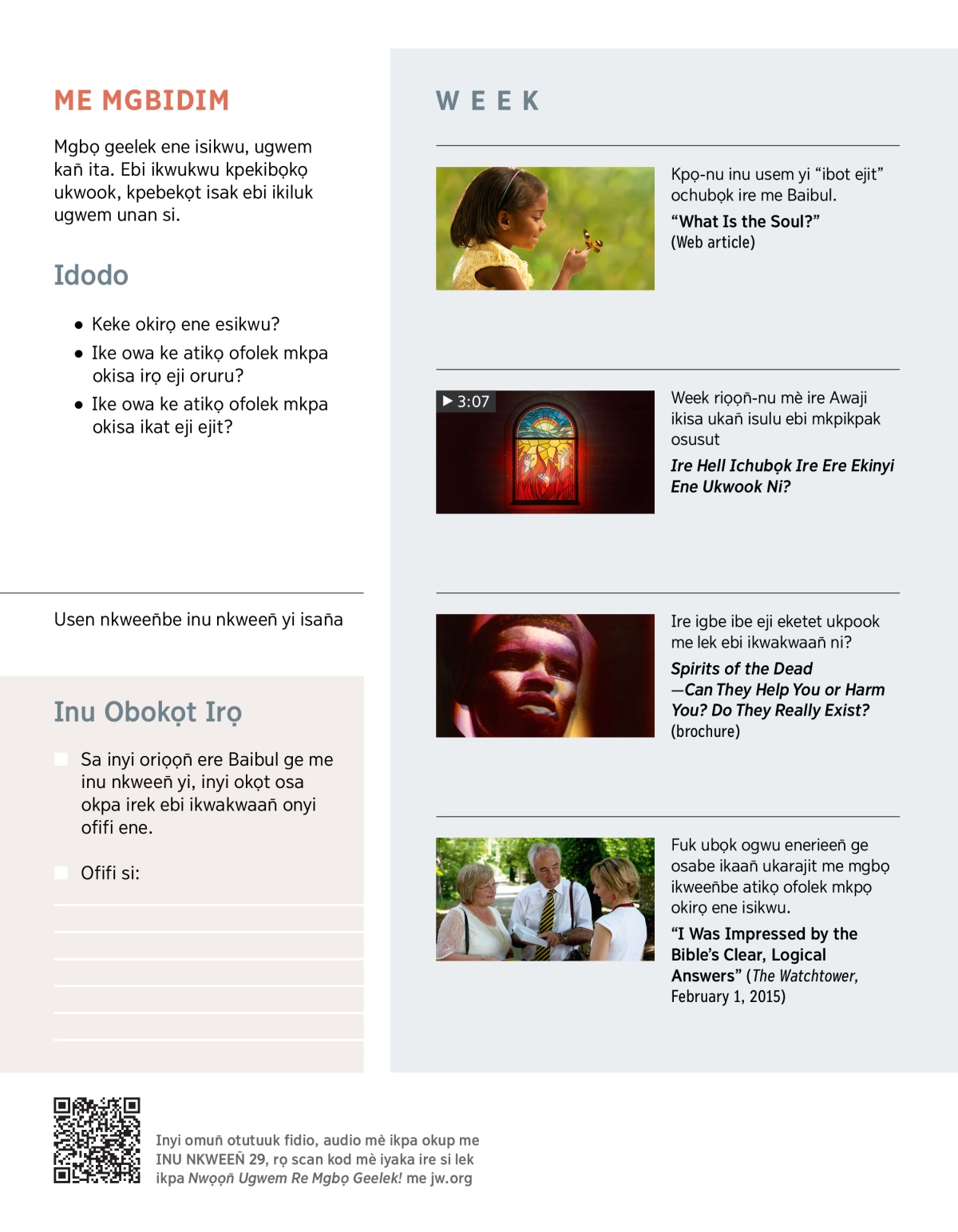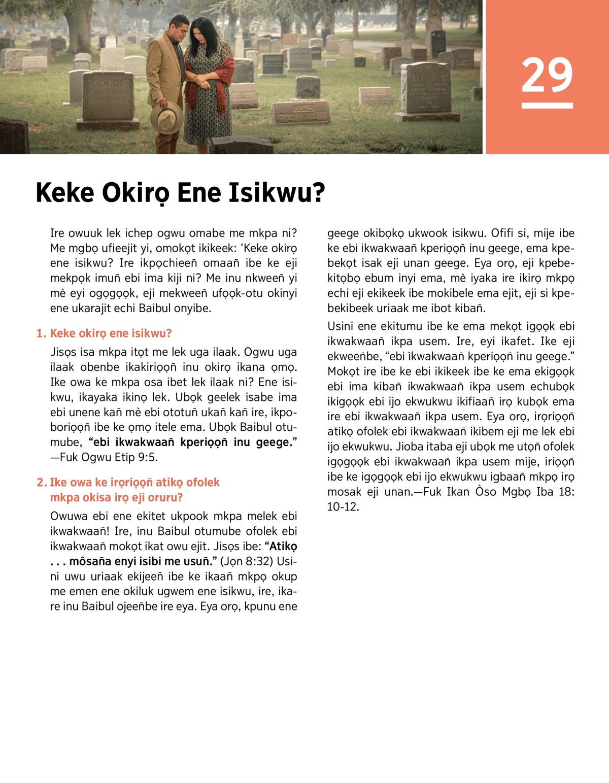 Ire owuuk lek ichep ogwu omabe me mkpa ni? Me mgbọ ufieejit yi, omokọt ikikeek: ‘Keke okirọ ene isikwu? Ire ikpọchieen̄ omaan̄ ibe ke eji mekpọk imun̄ ebi ima kiji ni? Me inu nkween̄ yi mè eyi ogọgọọk, eji mekween̄ ufọọk-otu okinyi ene ukarajit echi Baibul onyibe.