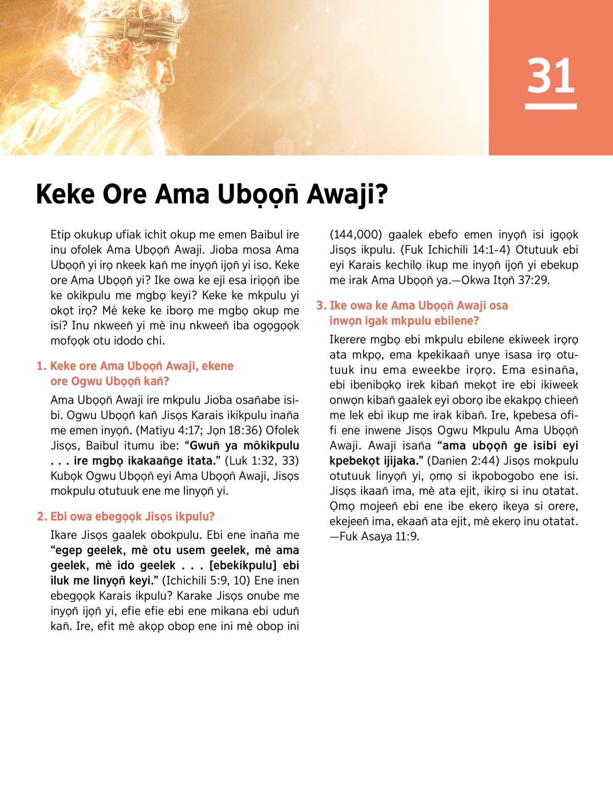 Ama Ubọọn̄ Awaji ire mkpulu Jioba osan̄abe isibi. Ogwu Ubọọn̄ kan̄ Jisọs Karais ikikpulu inan̄a me emen inyọn̄. (Matiyu 4:17; Jọn 18:36) Ofolek Jisọs, Baibul itumu ibe: “Gwun̄ ya môkikpulu . . . ire mgbọ ikakaan̄ge itata.” (Luk 1:32, 33) Kubọk Ogwu Ubọọn̄ eyi Ama Ubọọn̄ Awaji, Jisọs mokpulu otutuuk ene me linyọn̄ yi.
