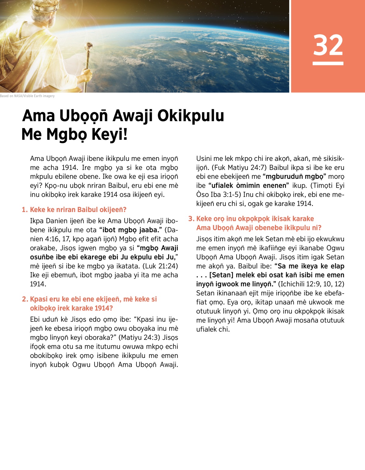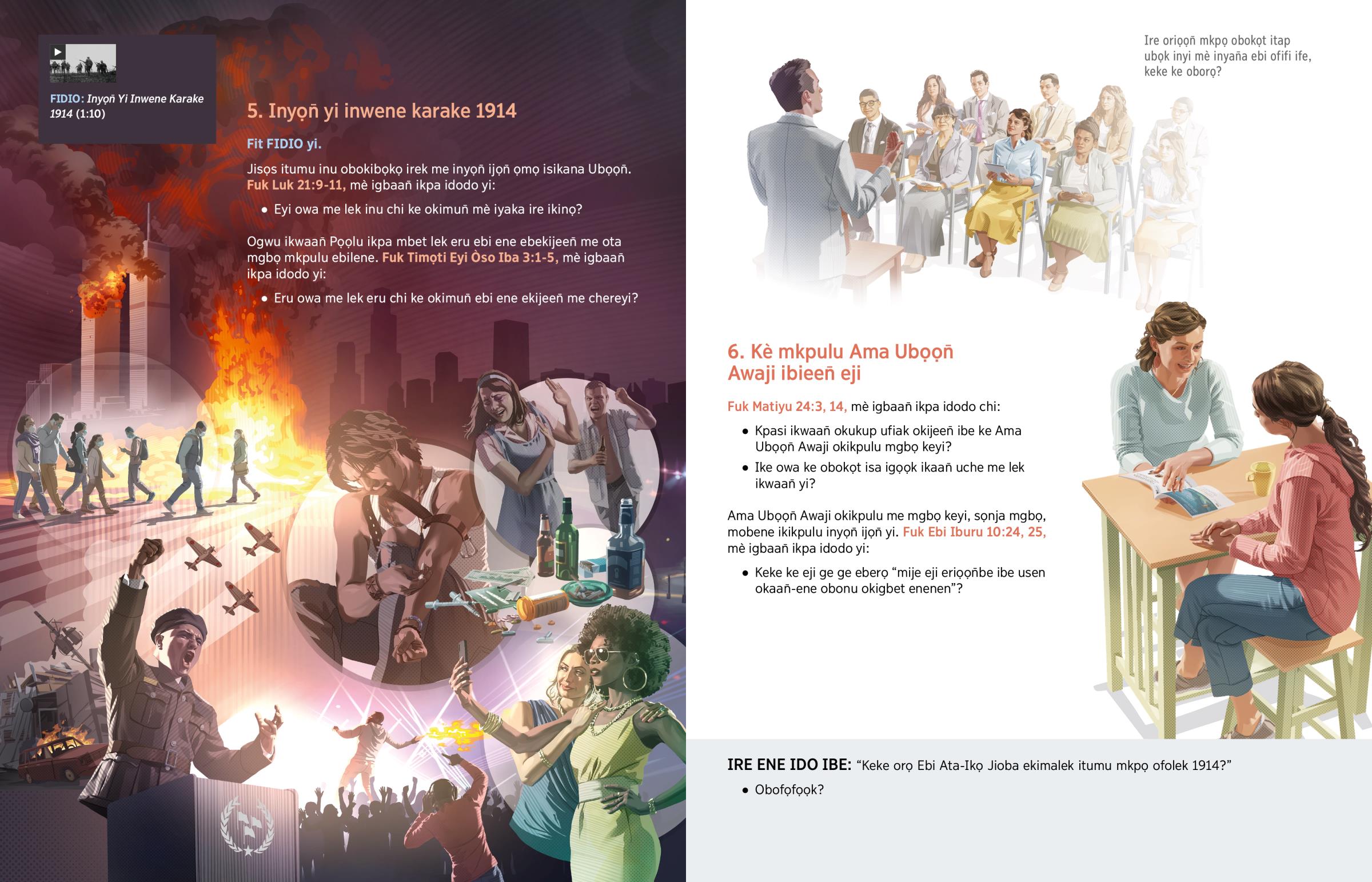Ama Ubọọn̄ Awaji ibene ikikpulu me emen inyọn̄ me acha 1914. Ire mgbọ ya si ke ota mgbọ mkpulu ebilene obene. Ike owa ke eji esa iriọọn̄ eyi? Kpọ-nu ubọk nriran Baibul, eru ebi ene mè inu okibọkọ irek karake 1914 osa ikijeen̄ eyi.