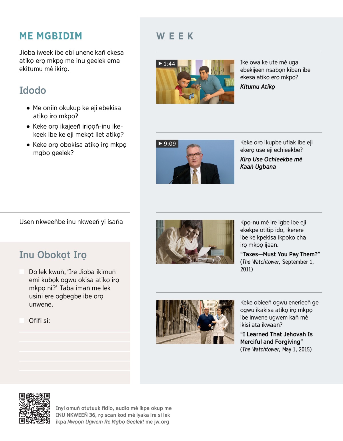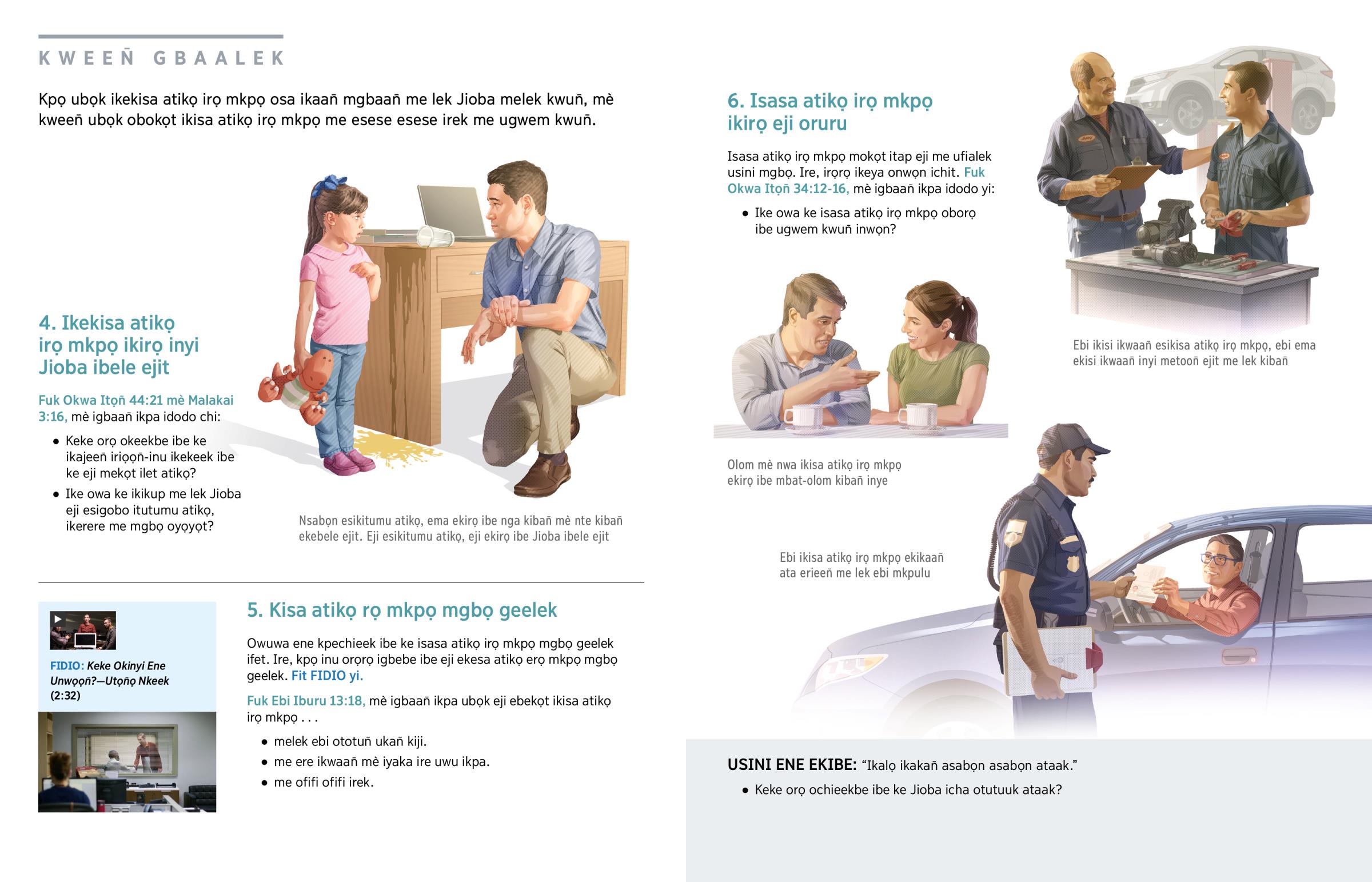 Jioba iweek ibe eji eketumu ‘atikọ enyi ebi melek kiji.’ (Jekaraya 8:16, 17) Eyi isibi keke? Ire eji ekitumu usem melek ebi uwu kiji, ebi ere ikwaan̄ kiji, bọn ute irieen̄ mè ibaan̄, mè iyaka ire ebi mkpulu, eji kpebekan̄ ataak mè iyaka ire itumu inu ikarege atikọ. Ebi ikisa atikọ irọ mkpọ kpekichiin̄ mkpọ ebi ofifi ene mè iyaka ire ifeen̄ ema. (Fuk Urọk 24:28 mè Ebi Efesọs 4:28.) Ema si ekikpekpe otutuuk otitip ido geelek ogbegbe ibe ema ekpe. (Ebi Rom 13:5-7) Me irek chi mè ofifi irek geelek, “eji ekiweek irọrọ inu òtatat me mgbọ geelek.”—Ebi Iburu 13:18.