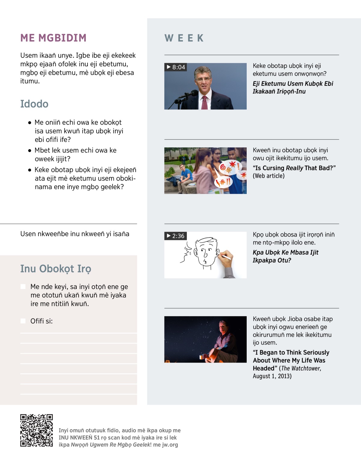 Mgbọ Jioba orombe eji, inyi eji uche osisibi esese—orere, ikọkọt ikitumu usem. Ire Awaji ikaan̄ ulọk me lek ubọk eji ekisa uche yi irọ mkpọ ni? Iin̄, ikaan̄! (Fuk Jemis 1:26.) Ire ikeya, ike owa ke eji ebekisa uche ikekitumu usem irọ mkpọ me oniin̄ obokibele Jioba ejit?