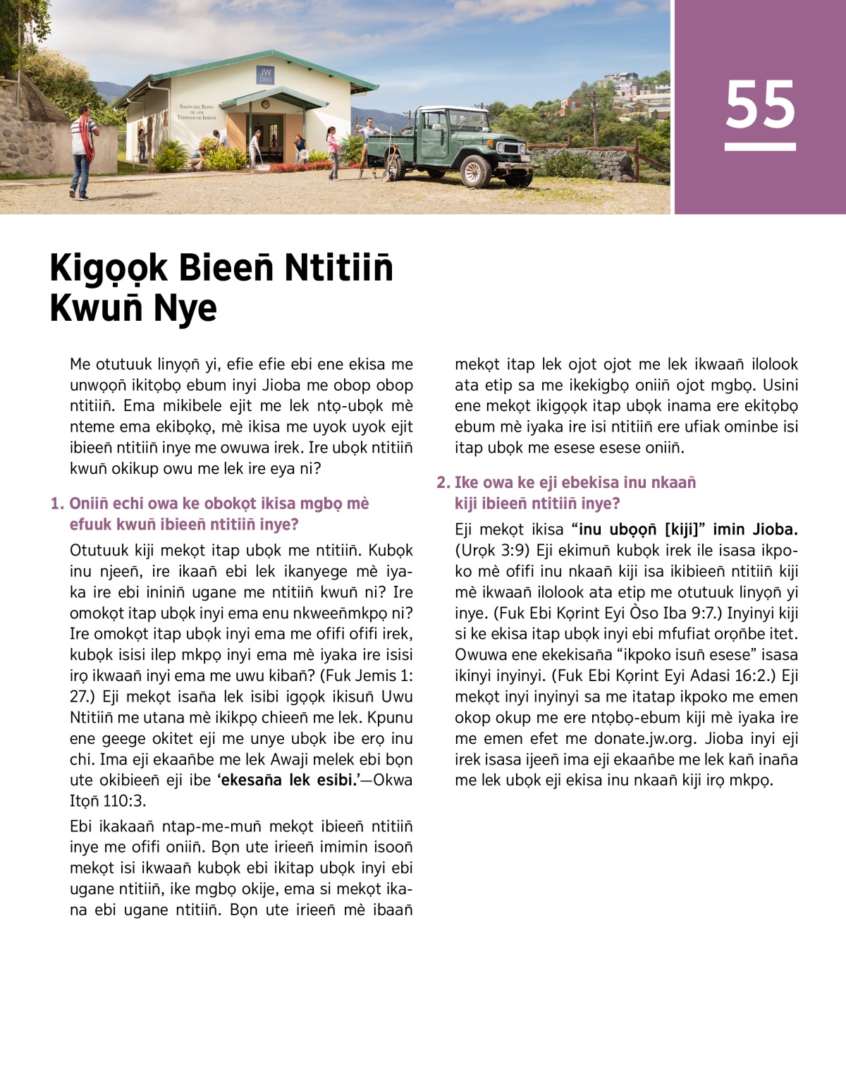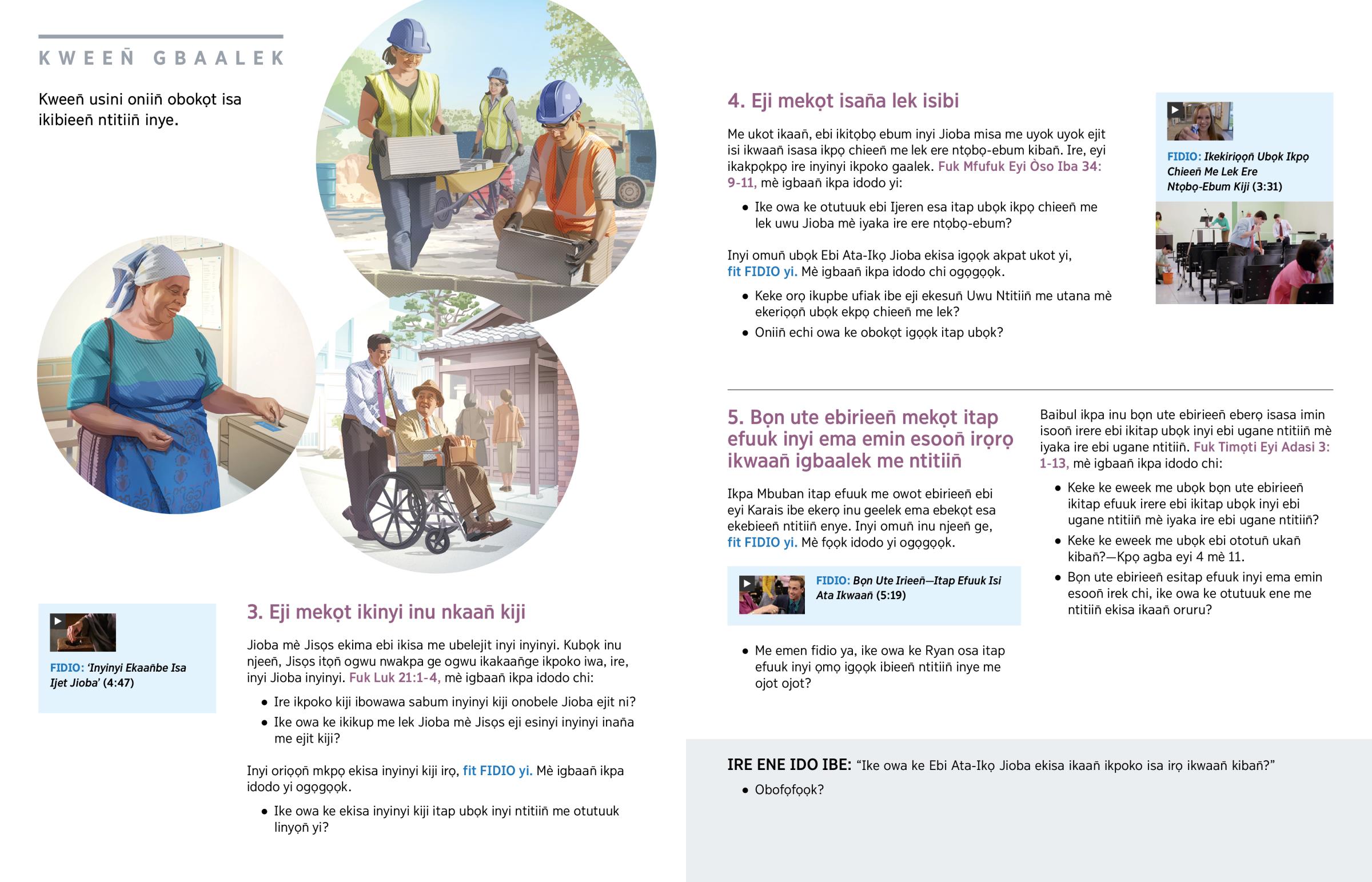 Eji mekọt ikisa “inu ubọọn̄ [kiji]” imin Jioba. (Urọk 3:9) Eji ekimun̄ kubọk irek ile isasa ikpoko mè ofifi inu nkaan̄ kiji isa ikibieen̄ ntitiin̄ kiji mè ikwaan̄ ilolook ata etip me otutuuk linyọn̄ yi inye. (Fuk Ebi Kọrint Eyi Òso Iba 9:7.) Inyinyi kiji si ke ekisa itap ubọk inyi ebi mfufiat orọn̄be itet. Owuwa ene ekekisan̄a “ikpoko isun̄ esese” isasa ikinyi inyinyi. (Fuk Ebi Kọrint Eyi Adasi 16:2.) Eji mekọt inyi inyinyi sa me itatap ikpoko me emen okop okup me ere ntọbọ-ebum kiji mè iyaka ire me emen efet me donate.jw.org. Jioba inyi eji irek isasa ijeen̄ ima eji ekaan̄be me lek kan̄ inan̄a me lek ubọk eji ekisa inu nkaan̄ kiji irọ mkpọ.