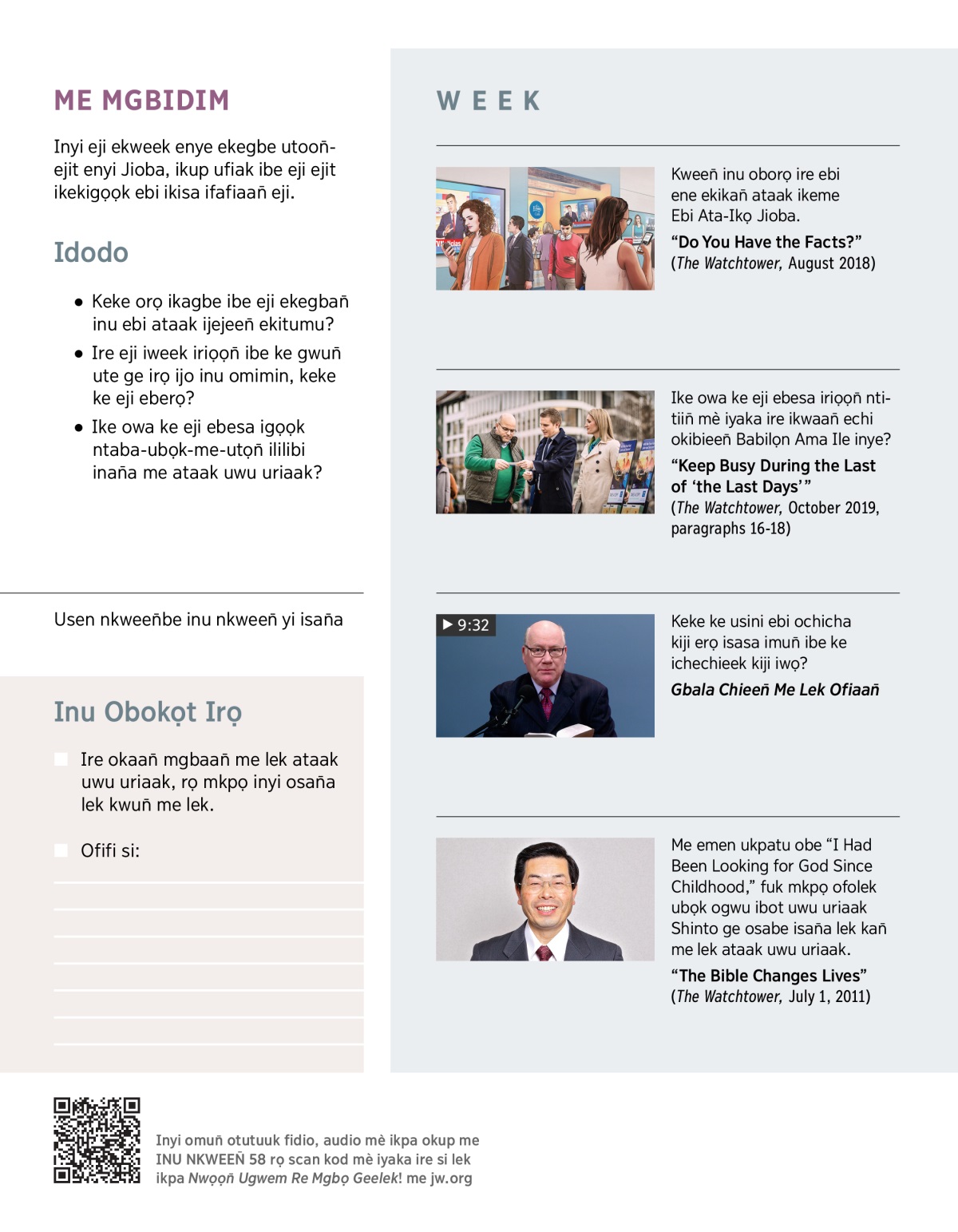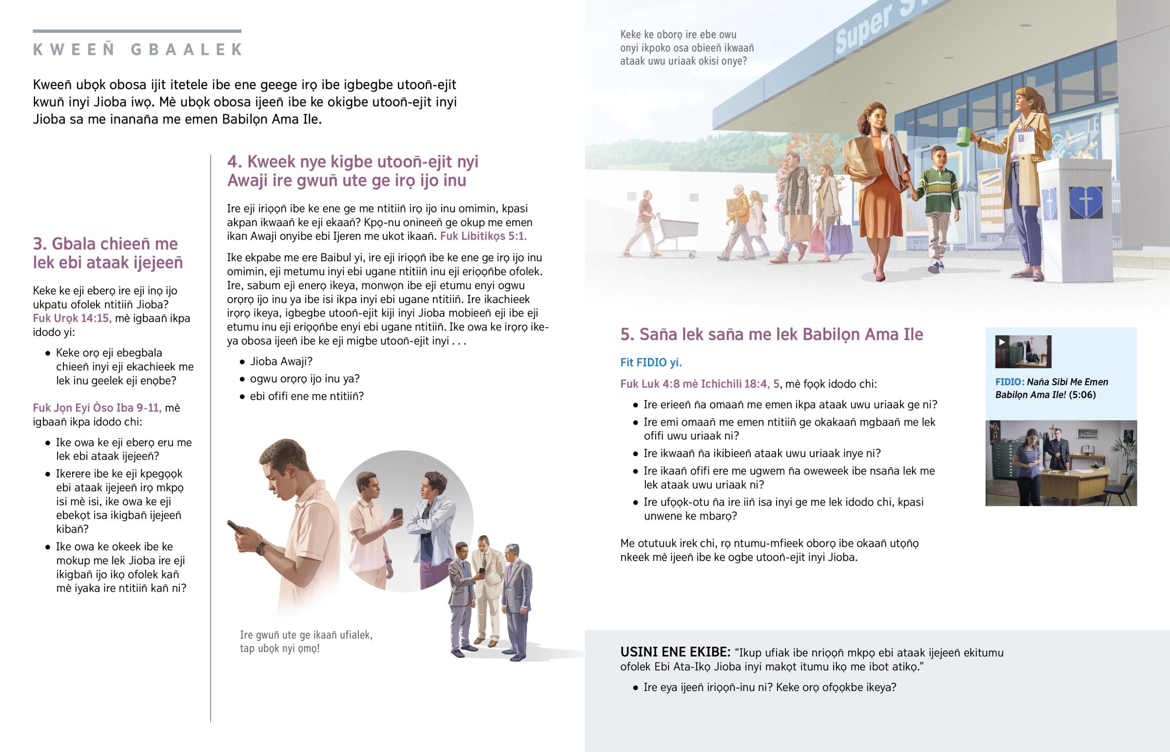 Ike ekpabe me ere Baibul yi, ire eji iriọọn̄ ibe ke ene ge irọ ijo inu omimin, eji metumu inyi ebi ugane ntitiin̄ inu eji eriọọn̄be ofolek. Ire, sabum eji enerọ ikeya, monwọn ibe eji etumu enyi ogwu orọrọ ijo inu ya ibe isi ikpa inyi ebi ugane ntitiin̄. Ire ikachieek irọrọ ikeya, igbegbe utoon̄-ejit kiji inyi Jioba mobieen̄ eji ibe eji etumu inu eji eriọọn̄be enyi ebi ugane ntitiin̄. Ike owa ke irọrọ ikeya obosa ijeen̄ ibe ke eji migbe utoon̄-ejit inyi . . .