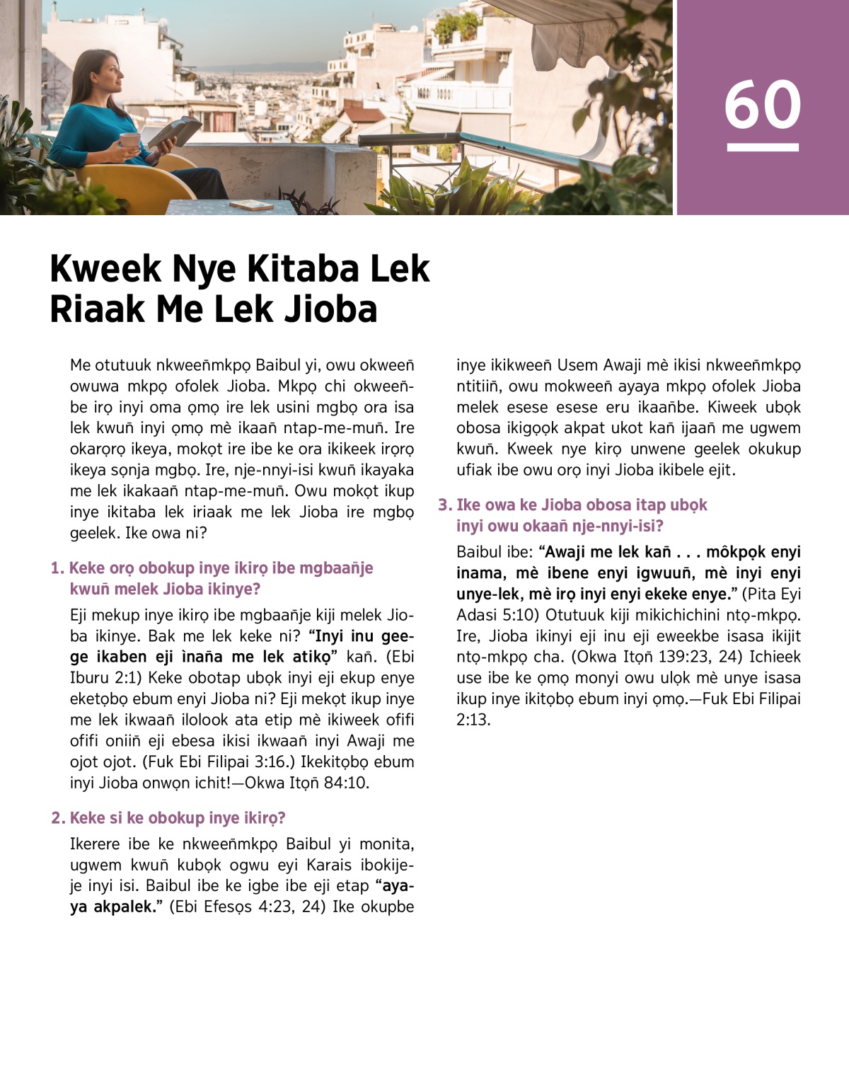 Me otutuuk nkween̄mkpọ Baibul yi, owu okween̄ owuwa mkpọ ofolek Jioba. Mkpọ chi okween̄be irọ inyi oma ọmọ ire lek usini mgbọ ora isa lek kwun̄ inyi ọmọ mè ikaan̄ ntap-me-mun̄. Ire okarọrọ ikeya, mokọt ire ibe ke ora ikikeek irọrọ ikeya sọnja mgbọ. Ire, nje-nnyi-isi kwun̄ ikayaka me lek ikakaan̄ ntap-me-mun̄. Owu mokọt ikup inye ikitaba lek iriaak me lek Jioba ire mgbọ geelek. Ike owa ni?